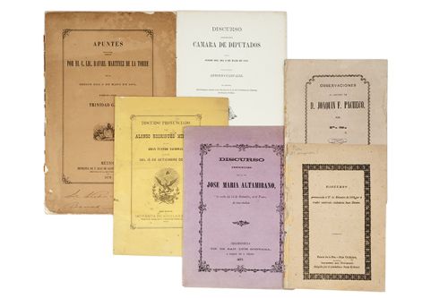 Subasta 710, Lote # 42 DI - Altamirano, José María / Carvajal, Antonio /Martínez de la Torre, Rafael / P. S. / Rodríguez Miramón, Alonso / Zenteno, Juan. Discursos. a) Altamirano, José María. Discurso pronunciado por el Dr. José María Altamirano la noche del 15 de Septiembre, en el Teatro de esta ciudad. Chalchicomula, Pue.: Tip. de San Luis Gonzaga, a cargo de J. Vélez, 1877. 8o. marquilla, 14 p. Encuadernado en rústica. b) Carvajal, Antonio. Discurso Pronunciado ante la Cámara de Diputados. En la sesión del día 3 de mayo de 1881 por el ciudadano Antonio Carvajal en defensa del dictamen relativo á las reformas de la ley de Contribuciones Directas del Distrito Federal. México: Imprenta de Francisco Díaz de León, 1881. 4o., 20 p. Páginas 1-8 desprendidas. Sin encuadernar. c) Martínez de la Torre, Rafael. Apuntes sobre el Discurso. Pronunciado por el C. Lic. Rafael Martínez de la Torre. En la sesión del 6 de mayo de de 1870, en defensa del C. Diputado Trinidad García. México: Imprenta de F. Díaz de León y Santiago White, 1870. 4o. marquilla, 52 p. Manchas de humedad. Encuadernado en rústica. d) P. S. Observaciones al discurso de D. Joaquín F. Pacheco. México: Imprenta de Juan Abadiano, 1862. 8o. marquilla, 46 p. Pasta anterior por desprenderse, manchas de humedad. Encuadernado en rústica. e) Rodríguez Miramón, Alonso. Discurso pronunciado por Alonso Rodríguez Miramón. En el Gran Teatro Nacional la noche del 15 de Septiembre de 1883. México: Imprenta de Aguilar e hijos, 1883. 8o. marquilla, 12 p. Manchas de humedad. Encuadernado en rústica. f) Zenteno, Juan. Discurso pronunciado el 27 de Septiembre de 1856 por el orador nombrado ciudadano Juan Zenteno. Puerto de la Paz, Baja california: Imprenta del Gobierno: dirigida por el ciudadano Jesús Echauri, 1856. 8o. marquilla, 8 p. Sin pasta posterior. Encuadernado en rústica. Total de piezas: 6. Estimado $3,000-4,000
