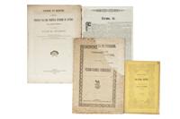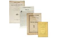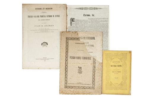 Subasta 710, Lote # 186 D - Alamán, Juan B. / Gutiérrez, Blas J. / Rodríguez de S. Miguel, Juan / Valdez Fernández, Pedro. Informe / Defensa / Contestación / Vindicación. a) Alamán, Juan B. Informe en Derecho. Pronunciado en los estrados de la Tercera Sala del Tribunal Superior de Justicia del Distrito Federal por el licenciado Juan B. Alamán por parte del señor doctor don Manuel Moreno Jove, curador de la señorita doña Josefa Sanz y González, en el juicio ejecutivo sobre pesos, con los señores Esteba Benecke y Compañía. México: Imprenta de Ignacio Escalante y Compañía, 1871. 4o. marquilla, 26 p. Manchas de óxido. Sin encuadernar. b) Gutiérrez, Blas J. Defensa del Lic. Blas J. Gutiérrez. Por la acusación que le hizo el Gobernador del Estado de Sinaloa, don Pomposo Verdugo. Mazatlán, Sin.: Blas J. Gutiérrez, 1857. 4o. marquilla, 30 p. + 1 h. Sin encuadernar. c) Rodríguez de S. Miguel, Juan. Contestación de los hijos de don Pablo Iriarte. A la manifestación que público la compañía de los señores Vega Hermanos, de Sinaloa. México: Imprenta de José Mariano Lara, 1858. 8o. marquilla, 112 p. Encuadernado en rústica. d) Valdez Fernández, Pedro. Vindicación del C. Pedro Valdez Fernández. Sobre los hechos criminales de que se le acusaba; con alguna observaciones realtivas á las honorables decretos números 81 y 84 que facultaron al Exmo. Señor Gobernador del Estado para la persecucion de ladrones y para conservar la tranquilidad pública. Querétaro: Imprenta del c. F. Frias, 1849. 4o. marquilla, 28 p. Alcance al Número 137 del Federalista. Faltante en esquina superior derecha de pasta anterior, manchas de óxido. Encuadernado en rústica. Total de piezas: 4. Estimado $3,000-4,000