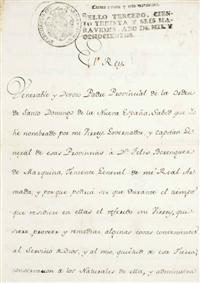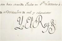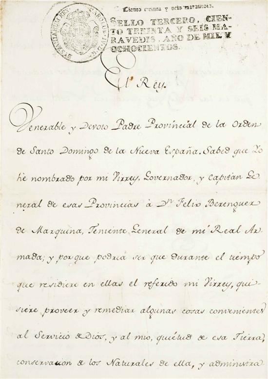 DM - Yo El Rey (Carlos IV). Orden. "Al provincial de la Orden de Santo Domingo de la Nueva España encargándole que en las cosas que al Virrey Don Felix Berenguer de Marquina se le ofrecieren, en quanto sea necesaria su autoridad, procure conformarse con el ayudándole con todo para el buen efecto". San Lorenzo á 17 de Noviembre de 1800. Firmado. Picado, no afecta texto. Estimado $6,000-8,000