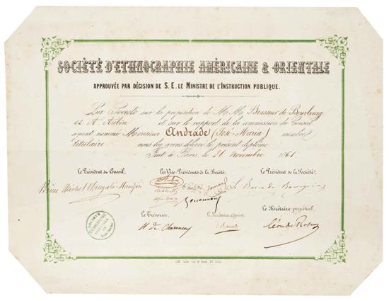 DI - Société D' Ethnographie Américaine & Orientale. Diploma. Approuvée par Décision de S.E. le Ministre de L'Instruction Publique. "La Sociéte sur la proposition de M. M. Brasseur de Bourbourg es A. Aubin et sur le rapport de la commission du Conseul ayant nomme Monsieur Andrade (José María) membre titulaire nous ley avons delivré le présent diplóme". Fait á Paris le 28 Novembre 1861. Lith. Callet, rue de Seine, 53, Paris. Con firmas de Prince Michel Vlangali - Handjéri, León de Rosny, Brasseur de Bourbourg, Alexis Aubin y otros. Manchas de óxido. Estimado $6,000-8,000