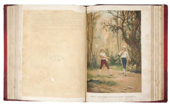 Subasta 710, Lote # 288 HU - Danton G:. 18 (Oneca, Niceto). Historia General de la Masonería. Barcelona: D. Jaime Seix y Compañía / Jaime Seix Editor 1889 y 1883. 4o. marquilla, 703 + VII + 11; 1124 + 11 p. + h. Desde los tiempos más remotos hasta nuestra época. Sus orígenes, sus causas, desarrollo y desenvolvimiento; Su influencia en las instituciones sociales y políticas, y en las artes. Sus vicisitudes, sus luchas y persecuciones. Exposición de sus ritos y liturgias, modificaciones que ha sufrido en el tiempo y parte activa que ha tenido en las revoluciones y emancipaciones de los pueblos antiguos y modernos. Sus hombres notables. La masonería y el jesuitismo, estudio comparativo de ambas asociaciones. Sus estatutos generales, constituciones y reglamentos. Revelación de sus símbolos y explicación de sus misterios y fórmulas. Fines generales de esta asociación y sus carácter en los distintos pueblos y épocas. Obra escrita en presencia de lo mejor que acerca de esta materia se ha dicho en Francia, Inglaterra y Alemania. Prólogo de D. Emilio Castelar. Ilustrado con cromolitografías. Tomo I: Tercera edición. 19 láminas. Tomo II: Primera dición. 10 láminas. Tomo II: Anteportada deteriorada, primeras hojas con pequeños faltantes en cantos. Encuadernados en pasta dura, lomo y puntas en piel. Piezas: 2. Estimado $16,000-20,000