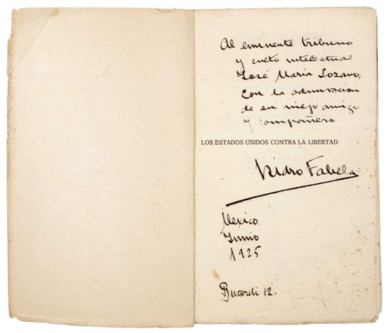Subasta 710, Lote # 262 HM - Fabela, Isidro / Un Antiguo Oficial Mejicano / Romero, Matías / Solís Cámara, Fernando / . Los Estados Unidos Contra la Libertad / Reflexiones / Estudio Sobre la Anexión de México / México y los Estados Unidos / . a) Fabela, Isidro. Los Estados Unidos Contra la Libertad. Barcelona: Talleres Gráficos "Lux", sin año. 8o. marquilla, 311 p Estudio de Historia Diplomática Americana (Cuba, Filipinas, Panamá, Nicaragua, Repúbilca Dominicana). Dedicado y firmado por el autor, Mexico Junio 925. Sin refinar. Encuadernad en rústica. b) Un Antiguo Oficial Mejicano (I. L. U.). Reflexiones. San Francisco, 1887. 4o., 15 p. Sobre lo que México necesita para su defensa contra la absorción con que la amenazan los Estados Unidos de Norte América. Mancha de humedad en media caña. Encuadernado en rústica. c) Romero, Matías. Estudio Sobre la Anexión de México á los Estados Unidos. México: Imprenta del Gobierno en el Ex - Arzobispado, 1890. 8o. marquilla, 112 p. Sin lomo, pastas con faltantes en puntas. Encuadernado en rústica. d) Solís Cámara, Fernando. México y los Estados Unidos. México: Imp. A. Enríquez, sin año. 8o. marquilla, 29 p. Al Borde de la Intervención. Dedicado y firmado por el autor. Encuadernado en rústica. e) Carreño, Alberto María. México y los Estados Unidos de América. México: Imprent Victoria, 1922. 4o. marquilla, 521 p. Apuntaciones para la historia del acrecentamiento territorial de los Estados Unidos a costa de México desde la época colonial hasta nuestros días - 1913 -. Prólogo de Francisco Sosa. Profusamente ilustrado con reproducciones de firmas, documentos, planos y mapas. Sin refinar. Encuadernad en rustica. Total de piezas: 5. Estimado $6,000-8,000
