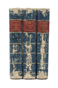 HU - Robertson, William. Histoire de l'Amérique. Paris: Chez Janet et Cotelle 1818. 8o. maquilla, XXXI + 487; 539; 513 p. Traduite de l'anglois par Suard et Morellet. Nouvelle édition revue, corrigée et augmentée des livres neuvième et dixième. Con 4 grandes mapas plegados y una tabla cronológica. Los mapas y la tabla son: "Carte du Golfe du Mexique des Iles et des pays adjacents". "Carte de l'Amérique Méridionale" (Brésil, Pérou, Chili, Argentine, Paraguay, etc.). "Carte du Mexique et de la Nouvelle Espagne". "Carte des pays situés sur la mer du sud depuis Panama jusqu'à Guayaquil". "Table Chronologique des Mexicains". Pastas y lomo gastados. Encuadernados en pasta dura. Piezas: 3. Estimado $4,000-5,000