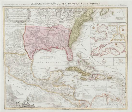 Subasta 710, Lote # 239 G - Lotter, Tobias Conrado. Mappa Geographica Regionem Mexicanam et Floridam. Augsburg: Ca. 1770. Terrasque Adjacentes, ut et Anteriores Americae Insulas, Cursus Itidem et Reditus Navigantium Versus Flumen Missisipi… Mapa grabado, coloreado. 50 x 58 cm. Enmarcado. Esta es una de las muchas versiones del mapa importante de De L'Isle de 1703 (Carte du Mexique et de la Floride). Proporciona una visión de América del Norte de los Grandes Lagos a través de las Indias Occidentales. Las colonias británicas se limitan al este en los montes Apalaches, Francia controla el valle del Mississippi y Florida, y España posee México; divisiones políticas según lo dictado por el Tratado de Utrecht en 1713. Nuevo México se describe finamente con muchas tribus y pueblos indígenas señaladas, incluyendo Acoma, Santa Clara, y la Isleta. Aunque geográficamente casi idéntica a la carta de De L'Isle, este mapa es muy decorativo en la esquina inferior izquierda se muestra una gran batalla en el mar y en el Atlántico lleno de cuatro planes de inserción de Panamá, La Habana, Cartagena y Vera Cruz. Grabado por Tobias Conrado Lotter y publicado por primera vez por el suegro de Lotter, Matthais Seutter, esta edición fue publicada por Lotter después de que él heredó la placa en 1758. Estimado $24,000-28,000