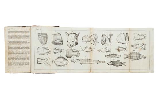 Subasta 710, Lote # 177 CO - Rementería y Fica, Mariano de (Traductor) / Arte Novisimo de Cocina Aumentado. Manual del Cocinero, Cocinera, Repostero, Pastelero, Confitero y Botillero / Escelente Colección de las Mejores Recetas. a) Rementería y Fica, Mariano de (Traductor). Manual del Cocinero, Cocinera, Repostero, Pastelero, Confitero y Botillero. Con el método para trinchar y servir toda clase de viandas, la cortesanía y urbanidad que se debe usar en la mesa. Paris: Librería de Lecointe, 1844. 16o. marquilla, 356 p. Con una lámina plegada, presenta faltante. Aumentada con muchos artículos nuevos: El modo de conservar toda clase de sustancias alimenticias, los pescados frescos, y una noticia curiosa sobre toda clase de vinos nacionales y extranjeros, sus propiedades y modos de servirlos en las mesas. Texto amarronado. Encuadernado en pasta dura, lomo en piel. b) Arte Novisimo de Cocina Aumentado. Escelente Colección de las Mejores Recetas. Paris: Librería de Rosa, 1849. 16o. marquilla, 396 p + 2 láminas plegadas. Lo mas selecto acerca de la reposteria, la conservacion de las legumbres y viandas; arte de trinchar y de servir mesas. Texto amarronado, manchas de humedad, lomo deteriorado, sin puntas. Encuadernado en pasta dura, en piel. Total de piezas: 2. Estimado $6,000-8,000