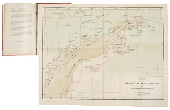 Subasta 710, Lote # 222 EX - Nordenskjöld, Otto / Saboya, Luis Amadeo de. Viaje al Polo Sur / La Estrella Polar en el Mar Ártico. 1899-1900. a) Nordenskjöld, Otto. Viaje al Polo Sur. Expedicion Sueca a bordo del "Antartico". Barcelona: Establecimiento Tipografico de la Casa Editorial Maucci, 1904 - 1905. 4o. marquilla, 592; 653 p. . Con 350 ilustraciones, 4 mapas y 5 laminas tricolores. Tomo I - Mapa plegado del territorio Antártico Occidental, rasgado. Tomo II - Mapa preliminar plegado, rasgado. Sin puntas, lomo y pastas gastados. Encuadernados en pasta dura, lomo en piel. Piezas: 2. Nils Otto Gustaf Nordenskjold (Sjogelo, 6 de diciembre de 1869 - Gotemburgo, 2 de junio de 1928) fue un geólogo, geógrafo y explorador polar sueco. En octubre de 1901, Otto de 32 años, parte de Gotemburgo en el buque Antartic junto a otros seis cientificos rumbo a la Antartida, en el mes de diciembre la expedición parte luego de aprovisionarse en Buenos Aires hacia las Islas Malvinas, habiendose incorporado a ella el alférez de la Armada Argentina José María Sobral. En febrero de 1902, Nordenskjold y su grupo desembarca en la isla Paulet para continuar por sus propios medios hacia el sur y establecer finalmente su base en la isla Cerro Nevado (Snow Hill) para invernar, mas tarde en el mes de noviembre de ese mismo año, el Antartic al mando del capitan Larsen, de regreso de las islas Malvinas enfrenta hielos en navegacion que le bloquean el avance hacia la isla de Cerro Nevado y un mes después Larsen destaca a bordo de un bote ballenero a un grupo integrado por Andersson, Duse y Toralf Grunden con la intencion de lograr hacer contacto con Nordenskjold. En el año de 1903 se lleva a cabo el rescate de la expedicion de Otto Nordenskjold. b) Saboya, Luis Amadeo de. La Estrella Polar en el Mar Ártico. 1899-1900. Barcelona: Casa Editorial Maucci, 1903. 4o. marquilla, XV + 421; 311 p. Con 243 ilustraciones, 2 panoramas, 3 mapas y un plano. Manchas de óxido y humedad, lomo y pastas gastados. Piezas: 2. Narración muy completa con episodios de caza, aventuras y técnicas de supervivencia. Contiene fotografía de la isla de Northbrook, foto de la bahía de Teplitz, un mapa litográfico de la misma bahía, un mapa de la ruta de H. Cagni, etc. Van incluídas dos relaciones: del comandante Humberto Cagni acerca de la expedición con trineos hacia el Polo Norte, y la relación del doctor Aquiles Cavalli-Molinelli acerca del regreso con los trineos desde el paralelo 83 a la bahía de Teplitz. Total de piezas. 4. Estimado $6,000-8,000