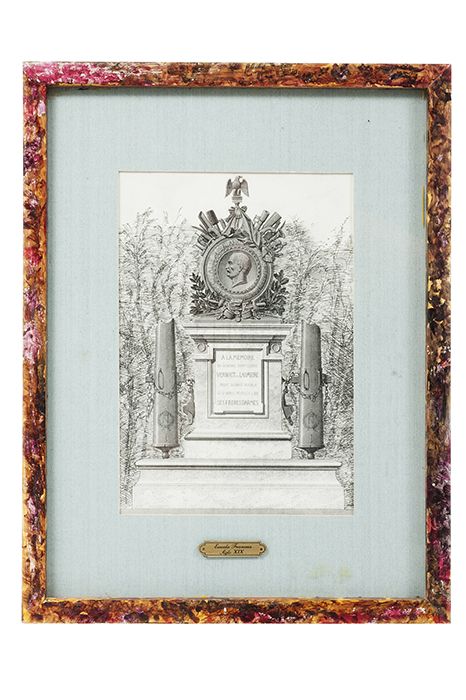 Escuela Francesa del Siglo XIX. Tumba para un Militar Caído en la Batalla de Puebla. Dibujo a pluma, 22 x 15 cm. Enmarcado. Los Monumentos Funerarios eran un tema obligado para los alumnos de la Escuela de Bellas Artes de París, y los arquitectos de aquella época se inspiraban para este género de construcciones en la morfología arquitectónica grecorromana, así como en el repertorio de la Edad Media, bien fuera del llamado estilo románico o bien del gótico. A pesar de que el autor no ha podido identificarse, el trazo dibujístico es característico de la Escuela de Bellas Artes de París al mediar el siglo XIX. Estimado $4,000-5,000
