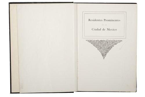 B - Residentes Prominentes de la Ciudad de Mexico. Sin pie de imprenta, principios Siglo XX. 4o. marquilla, 171 p. Título en español y prefacio en ingles. "... Here may be found the photographs of the men who have been successful in their chosen vocations, whether in banking, in the professions, or in commerce...". Con una fotografía de cuerpo completo de Porfirio Díaz, 4 personajes por página de la pagina 10 a la 170, uno en la 171. Incluye profesión y dirección de cada uno. Lomo con raspaduras. Encuadernado en pasta dura. Estimado $4,500-5,500