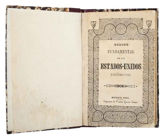 Subasta 710, Lote # 193 D - Código Fundamental de los Estados Unidos Mexicanos. México: Imprenta de Vicente Garcia Torres, 1847. 8o., 92 p. + 2 h. (Índice). I. Acta Constitutiva de la Federación Mexicana, sancionada en 31 de Enero de 1824. Páginas 1 a 18. II. Constitución Federal de los Estados Unidos Mexicanos, sancionada por el Congreso General Constituyente el 4 de octubre de 1824. Páginas 19 a 70. III. Acta Constitutiva y de Reformas, sancionada por el Congreso Extraordinario Constituyente de los Estados Unidos Mexicanos, el 18 de mayo de 1847. Jurada y promulgada el 21 del mismo. Páginas 71 a 92. Primera edición. Conserva pastas originales en rústica, pasta anterior con puntas restauradas y con rasgadura. Encuadernado en pasta dura, lomo en piel. La anexión de Texas y el conflicto fronterizo que se suscitó después de la anexión desencadenaron la intervención estadounidense en México. Como resultado de la misma, la Constitución de 1824 fue restaurada por el presidente interino José Mariano Salas el 22 de agosto de 1846. El 21 de mayo de 1847 fue publicada El Acta de Reformas la cual restablecía oficialmente, con algunos cambios, la Constitución Federal de 1824 mientras una nueva constitución fuera redactada. Esta fase federalista culminó en 1853. Estas reformas establecieron las garantías individuales, se suprimió el cargo de vicepresidente y se adoptaron las elecciones directas para diputados, senadores, Presidente de la República y magistrados de la Suprema Corte. Se facultó al Congreso para anular las leyes de los estados que implicaran una violación al pacto federal, y se establecieron los derechos de petición y de amparo. Estimado $18,000-24,000