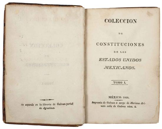 Subasta 710, Lote # 191 D - Colección de Constituciones de los Estados Unidos Mexicanos. México: Imprenta de Galván a cargo de Mariano Arévalo, 1828. 16o. marquilla, XV - XX + 473 + XIV p. Tomo I. Con las Constituciones de: Chiapas, Chihuahua, Coahuila y Tejas, Durango, Guanajuato y México. La Constitución de Coahuila y Tejas es la primera edición de la misma. Reproduce el texto de la Constitución Federal de 1824 y el Acta Constitutiva de la Federación Mexicana, con el Grabado del Escudo Nacional por José M. Torreblanca. Sin cofia, sin pie, puntas gastadas, cajo anterior quebrado y lomo con faltante en parte inferior. Encuadernado en pasta dura, en piel. Tras la abdicación de Agustín de Iturbide al Primer Imperio Mexicano, se estableció un Supremo Poder Ejecutivo formado por un triunvirato cuyos integrantes eran los generales pedro Celestino Negrete, Nicolás Bravo y Guadalupe Victoria, cuyos suplentes fueron José Mariano de Michelena, Miguel Domínguez y Vicente Guerrero. Este Supremo Poder Ejecutivo fue un gobierno provisional que convocó un nuevo Congreso Constituyente que se instaló el 7 de noviembre de 1824. El 31 de enero de 1824 se aprobó el Acta Constitutiva de la Federación, la cual era un estatuto provisional del nuevo gobierno. La nación asumió oficialmente la soberanía y se constituyó por estados libres, soberanos e independientes. Durante los siguientes meses, continuaron los debates constitucionales. Estimado $20,000-25,000