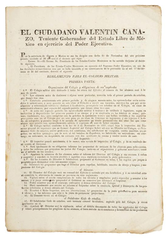 DI - Canalizo, Valentín. Reglamento para el Colegio Militar. "...Valentín Canalizo, Teniente Gobernador del Estado Libre de México en ejercicio del Poder Ejecutivo...decreta el siguiente Reglamento... 1o. El Colegio militar está destinado á todas las armas del Ejército: el número de los alumnos será á lo mas de ciento. 2o. Los alumnos antes de destinarse á alguna arma particular, cursarán todo el primer periodo de estudios que durará tres años...". Toluca á 29 de Octubre de 1834. Valentin Canalizo. Con pequeños surcos de polilla, manchas de óxido, afectan texto. Estimado $6,000-8,000
