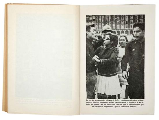 Subasta 710, Lote # 34 Movimiento Estudiantil México 1968. a) Sotelo Regil, Luis F. Tlatelolco: Desde el Punto de Vista Policiaco. Análisis fundamentado sobre la torpe actuación de los granaderos en los tumultos que culminaron con la tragedia del 2 de octubre de 1968 en la Plaza de las Tres Culturas. México, sin año. 4o. marquilla, 38 p. Ilustrado con fotografías y diagramas. Encuadernado en rústica. b) Indice Numerado y Alfabetico de Elementos Pertenecientes a Grupos Subersivos, Considerados Prófugos. 4o. marquilla, 84 h. Escrito a máquina. Engargolado. Contiene perfiles de 80 personas de interés gubernamental , acompañadas de fotografías originales. c) Libertad Presos Politicos. Linograbado, 35 x 24 cm. Pequeño faltante en punta superior derecha. Muchos carteles del movimiento del 68 fueron diseños de miembros de la TGP; sin embargo, con la excepción de uno de Mexiac, rara vez se firmaban estas obras. Total de piezas: 3. Estimado $6,000-8,000