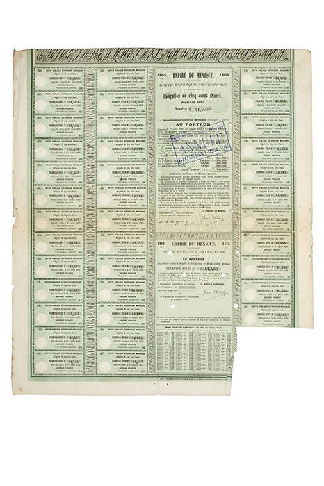 DI - Deuda Pública Exterior 1865. Imperio de Mexico - 1865. Obligación de Quinientos Francos. Primera Serie. No. 41465. Con la firma impresa de "El Ministro de México José Hidalgo". Con 39 cupones, faltan dos. Bordes deteriorados, con pequeños faltantes. Estimado $4,000-5,000