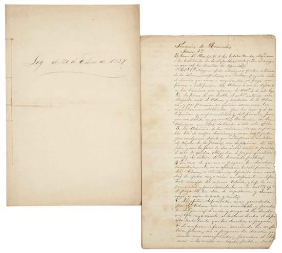 Subasta 710, Lote # 68 DM - Bocanegra, José María / Corro Justo, José. Ley de Aduanas / Decreto. a) Bocanegra. Ley de Aduanas. "...Art. 1o. Ningun efecto estrangero podra estraerse de la aduana respectiva sin haberse pagado antes el derecho que...ó augurandose su pago confianza o satisfaccion del Administrador ó en su defecto en los términos que expresa el Art. 4 de esta ley...". México, Diciembre 11 de 1833, firmado Bocanegra. En 3 hojas, Ley de Aduanas decretada por el Congreso General, consta de 25 artículos. b) Corro Justo, José. Decreto. "...Art. 1o. Se declaran autorizados los Ministros de la Tesorería General de la República, los gefes principales de Hacienda de los departamentos, los aministradores, y en general todo empleado encargado de la cobranza de las rentas, contribuciones y deudas del Erario, con responsabilidad directa... para ejercer las facultades economico coactivas, a fin de hacer efctiva su recomendacion y el vobro de los créditos pendientes...". 20 de Enero de 1837. Don José Justo Corro. 21 Artículos en 4 hojas, en los que se explica el procedimiento a seguir para recuperar créditos fiscales. Ambos documentos con manchas de óxido y pequeños faltantes en dobleces. Piezas: 2. Estimado $7,000-9,000
