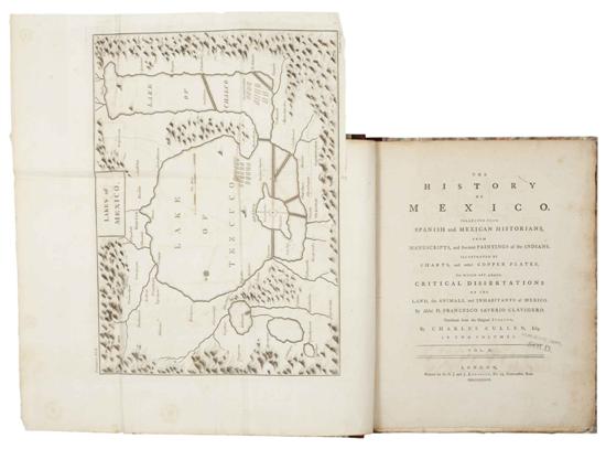 Subasta 710, Lote # 259 HM - Clavigero, Francesco Saverio. The History of Mexico. London: Printed for G. G. J. and J. Robinson, 1787. 4o. marquilla, XXXII p. + 2 h. + 476 p.; 2h. + 463 p. Collected from Spanish and Mexican historians, from manuscripts, and ancient paintings of the Indians. Illustrated by Charts, and other copper plates. To which are added critical dissertations on the land, the animals, and inhabitants of Mexico. Translated from the Original Italian, by Charles Cullen, esq. in two Volumes. Tomo I: con frontispicio (mapa del Anahuac, plegado), y con 24 láminas (grabados). Con manchas de grasa al pie de las hojas y laminas, no afecta texto. Frontispicio con dos rasgaduras en dobleces y hoja de páginas 403 y 404 rasgada. Tomo II: con frontispicio (mapa "Lakes of Mexio", plegado), una lamina. Con ligeras manchas de grasa al pie de las hojas, sin afectar texto. Sin refinar. Lomos con desprendimientos. Encuadernados en pasta dura, lomo en piel. Piezas: 2. Palau: 55485. Francisco Xavier Clavijero, S. J., o Francisco Saverio Clavigero (Mexico 9 de septiembre de 1731 - Italia 2 de abril de 1787). Historiador y religioso novohispano. Durante varios años trabajo en su Historia Antigua de México, ya consultando las bibliotecas italianas que tenían libros sobre el tema, ya enviando correspondencia a sus amistades en Mexico para que consultaran las obras alli guardadas y le enviaran notas sobre tal o cual libro o códice. Originalmente la obra fue escrita en idioma español, sin embargo el padre Clavijero la tradujo al italiano, antes de mandarla imprimir. Así fue como en 1780 salió la obra a la luz y rápidamente fue recibida por los estudiosos de la época con gran satisfacción, al grado que no paso mucho tiempo antes que fuera traducida al inglés y al alemán. Habrían de pasar muchos años antes que la obra fuese publicada en español. Además, la primera edición castellana, publicada en Londres en 1824, fue una traducción de la versión italiana realizada por el español Jose Joaquín de Mora. Estimado $18,000-22,000