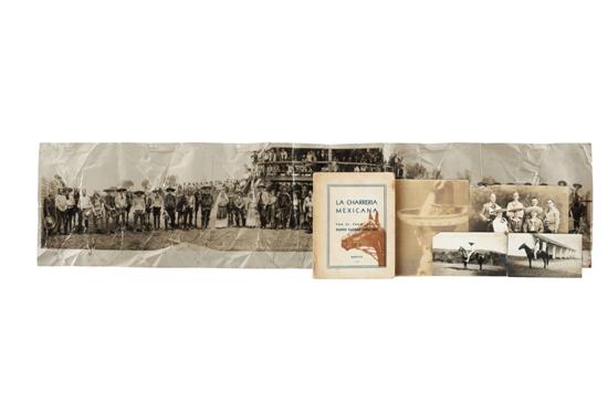 Subasta 710, Lote # 33 La Charrería en México. a) Vázquez Santa Ana, Higinio. La Charrería Mexicana. México, sin pie de imprenta, 1950. 8o. marquilla, 130 p. Manchas de óxido. Encuadernado en rústica. b) Charro con Sombrero. En sepia, 18 x 14 cm. Pequeño faltante en esquina inferior derecha. c) Siete charros. En sepia, 18 cm x 15 cm. Dobleces marcados, faltante en esquina superior izquierda.d) Charros a Caballo. 8 x 14 cm. Piezas: 2. e) Foto panorámica de la Asociación Metropolitana de Charros, Lienzo "El Caporal". 22 x 99 cm. México, Julio 1933. Con las firmas originales de los miembros. En sepia, 100 cm x 23 cm. Dobleces muy marcados, pequeños faltantes. Total de piezas: 6. Estimado $6,000-8,000