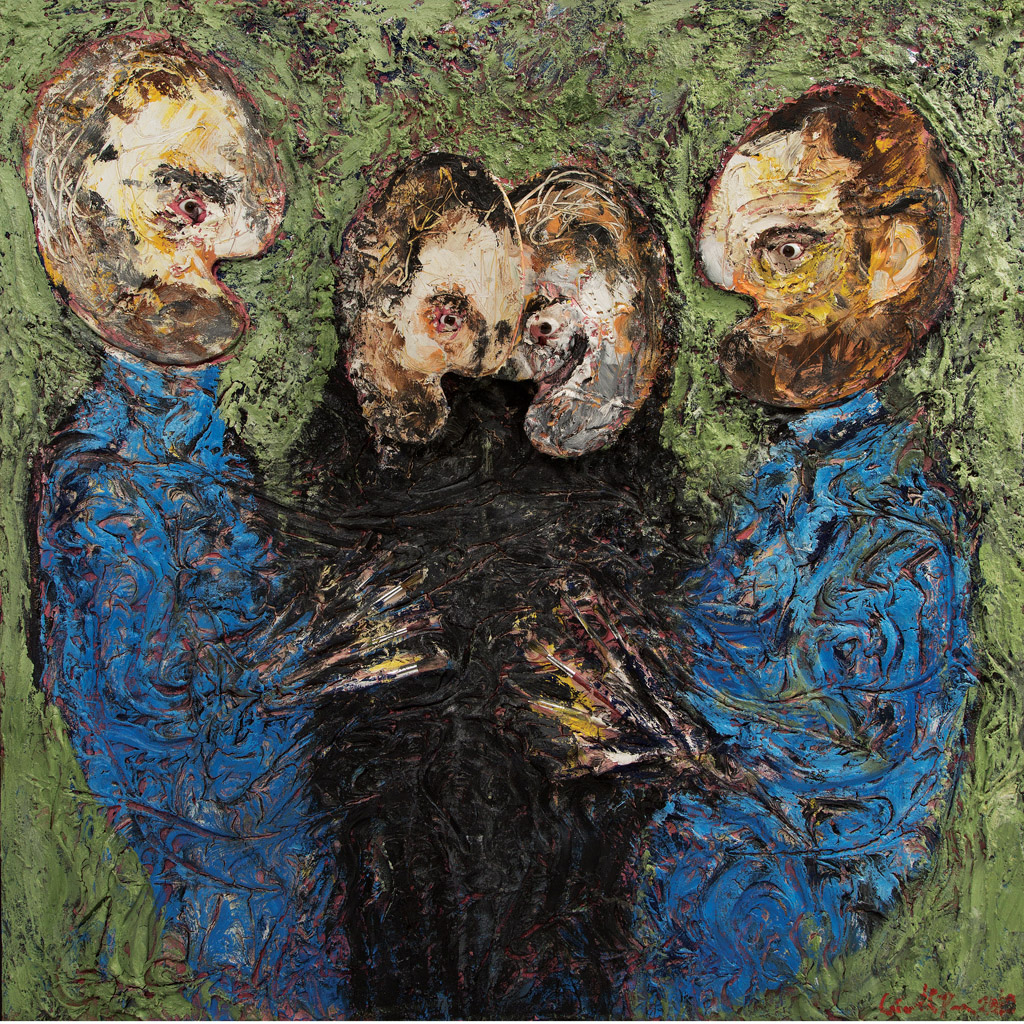 EMILIANO GIRONELLA PARRA Diálogo de artistas Firmada y fechada 2010. Mixta: óleo, hojas de oro y plata, ensamblaje de paletas para pintor, pinceles y ojos de vidrio sobre madera. Con constancia de autenticidad de El Aire Centro de Arte firmada por el artista. 122 x 122 x 15 cm