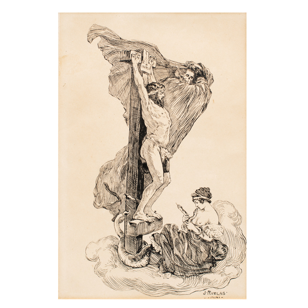 Subasta 745, Lote # 11 JULIO RUELAS Ilustración para el poema "La Piedad", de Jesús E. Valenzuela Firmada y fechada 1901. Tinta sobre papel. Con dictamen del Lic. Rafael Matos Moctezuma, marzo de 2015. (N. Zacatecas, 1870 - París, Francia, 1907) "Ruelas, desde el principio, es literario. Su precocidad, sus habilidades técnicas, su talento, los alcances de sus visiones desafiantes y perturbadoras: todo se ajusta a sus intereses y pasiones en asuntos de la escritura. De ahí la adhesión iconográfica a los cómplices de las generaciones de fines del siglo XIX, en especial los franceses, cuya presencia intriga, desasosiega, emociona en lo temático y formal a pintores y escritores. Poe y Baudelaire añaden a la poesía la dimensión del enigma, alternativamente trágico y desconcertante, y su decisión secularizadora es también una propuesta de la teología profana: en sus escritos Dios ya no es la totalidad de la vida del espíritu". Carlos Monsiváis. "Es sabido que Julio Ruelas repetía algunos dibujos, pues se empleaban para ilustrar, como en este caso, poemas de distintos autores. Este dibujo puede ser el que se publicó en la Revista Moderna, año IV, número 6, Pág. 97". Rafael Matos Moctezuma. En el libro "Julio Ruelas" editado por Casa de Bolsa Cremi en 1987, aparece referenciado otro muy parecido, pero fechado 1904, en la Pág. 109, lámina 102, mismo que se publicó en la Revista Moderna de México en octubre de 1907, Pág. 99. Ese mismo dibujo de 1904 está ilustrado en el libro "El viajero lúgubre. Julio Ruelas Modernista 1870 - 1907", editado por el MUNAL y editorial RM en 2007, Pág. 97, catalogado 38 y se menciona que también ilustró el libro "Almas y cármenes" de Jesús E. Valenzuela de 1904. Este dibujo de 1904 actualmente forma parte de la colección del Museo Nacional de Arte. Véase: "El viajero lúgubre. Julio Ruelas Modernista 1870 - 1907". México. Museo Nacional de Arte / Editorial RM, 2007, Pág. 63. 23.3 x 15.1 cm USD$2,200-$3,000 Estimado $30,000-40,000