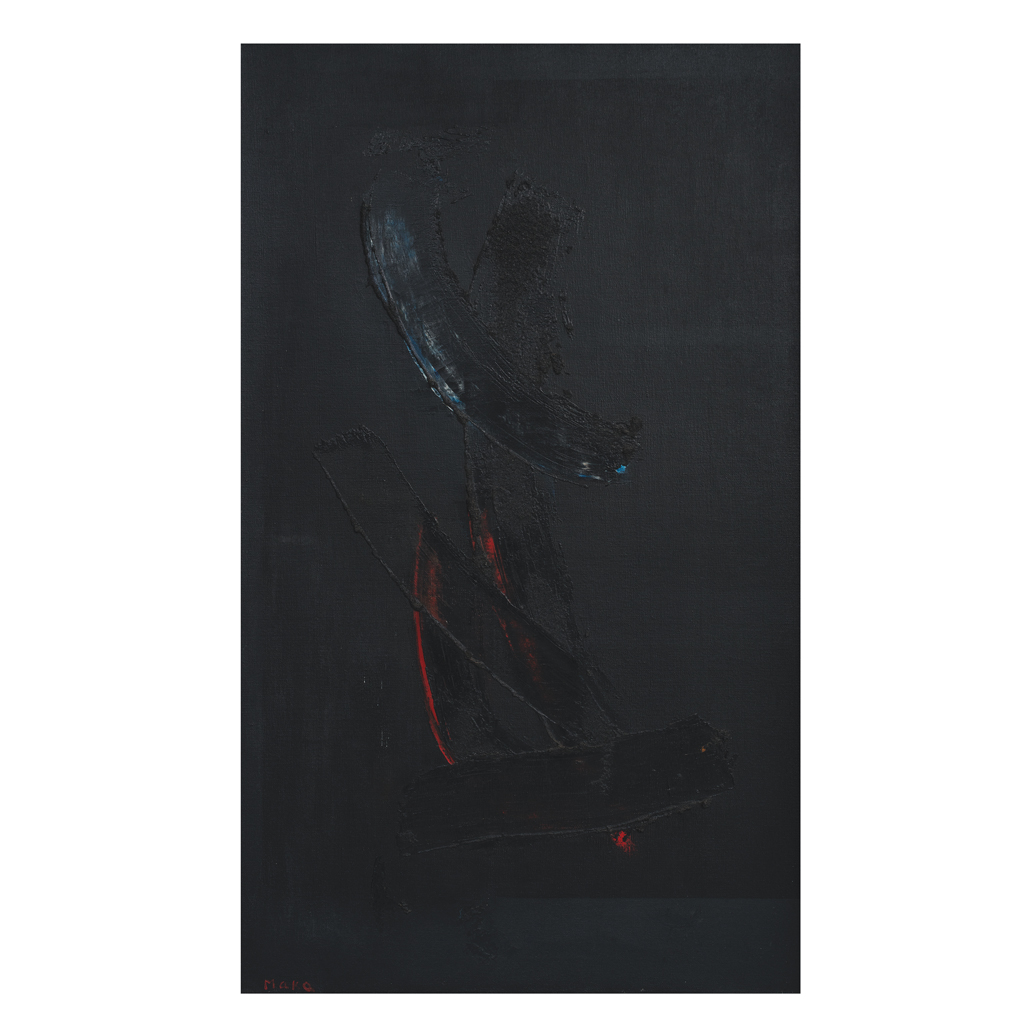 Subasta 745, Lote # 28 MAKA STRAUSS Abstracción, ca. 1961 Firmado. Óleo sobre tela. Con etiqueta de Galería Proteo, exposición de 1961. (N. París, Francia, 1925 - 1992) De madre mexicana y padre ruso emigrado a Francia, su nombre real era María del Carmen Hernández Fernández. Vivió su infancia y adolescencia en París, para posteriormente asentarse en México. Estudió la licenciatura en publicidad en la Universidad Nacional Autónoma de México. Comenzó a pintar en 1951 en el Taller de Manuel Rodríguez Lozano. Tuvo su primera exposición individual en 1955. A lo largo de su carrera, presentó su obra en galerías como el Salón de la Plástica Mexicana, Galería Pecanins, Proteo Gallery de Nueva York y Galería Norte - Sur en Caracas, Venezuela. Su obra pertenece a colecciones como la del Museo de Arte Moderno, ciudad de México, y la del museo de Tel Aviv. "Sus primeras manifestaciones pictóricas eran de un expresionismo que nada tenía de europeo. Hay bastante de influencia negra, antillana y del vudú, elementalmente establecidas en lo que a dominio técnico respecta, pero de una proyección emocional casi estridente. Es un expresionismo asentado tanto por el vigor sin freno de la mancha como por la intención de la expresividad de la misma.[…] Hubo el periodo de abstraccionismos nacidos de excesivamente su notoria obsesión de Soulages, con todo y sus fondos negros surcados por parcas pinceladas encendidas". Margarita Nelken. Véase: ÁLVAREZ, José Rogelio, director. "Enciclopedia de México". México. E. de M., tomo IX, 1996, Pág. 4916. NELKEN, Margarita. "El expresionismo en la plástica mexicana de hoy". México. Instituto Nacional de Bellas Artes, 1964, pp. 115 y 119. 100 x 60 cm USD$2,200-$3,300 Estimado $30,000-45,000