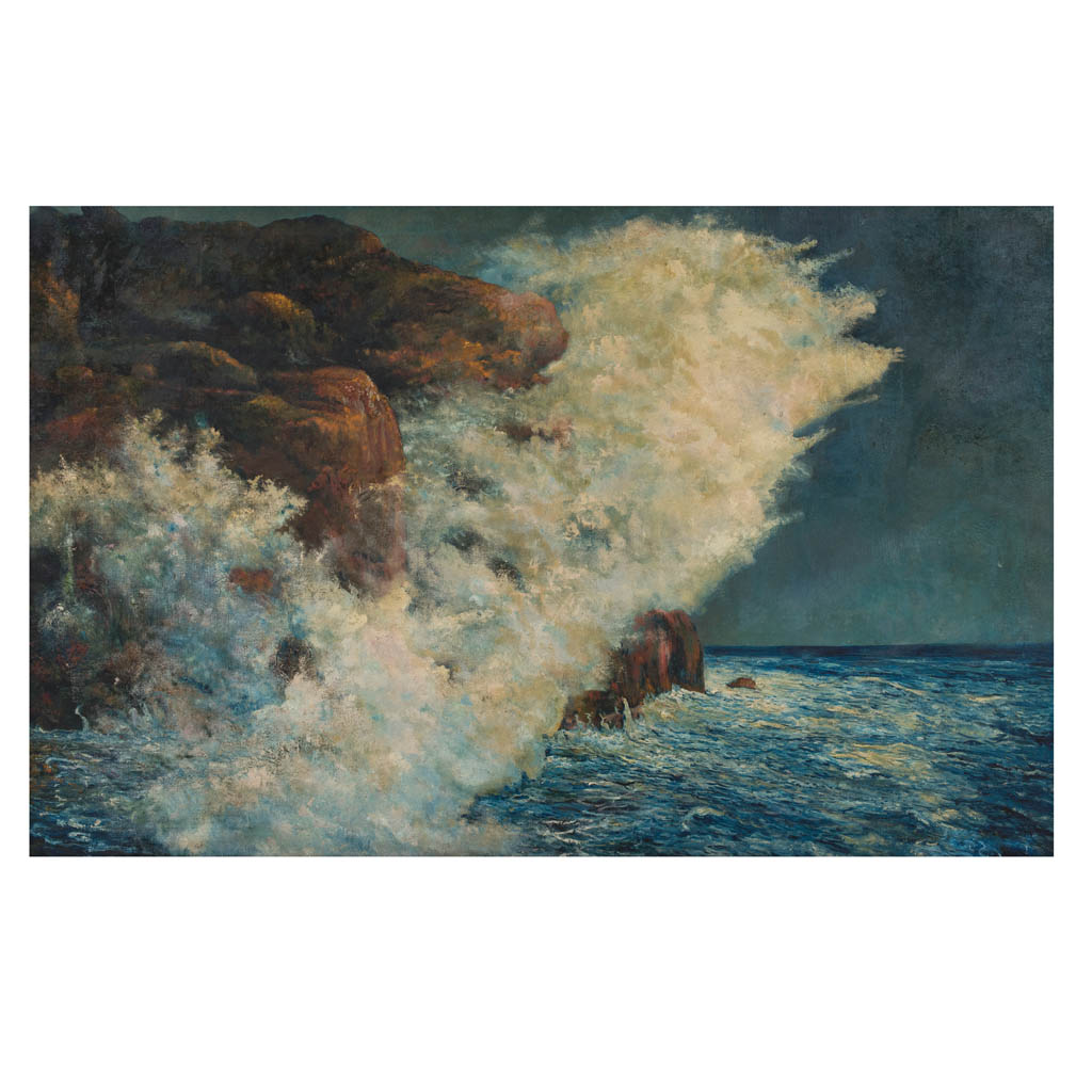 Subasta 745, Lote # 110 JOAQUÍN CLAUSELL La ola grande Sin firma. Óleo sobre tela. Incluye ensayo de la Mtra. María Amparo Clausell. Publicado en: GARCÍA PONCE, Juan. " Joaquín Clausell. Óleos y murales". México. Fondo Editorial de la Plástica Mexicana - Banco Nacional de Comercio Exterior, 1973, Pág. 97, en dicha publicación la fotografía fue editada para que pareciera que está firmada. Presenta una restauración mínima. (N. San Francisco de Campeche, 1866 - Lagunas de Zempoala, Morelos, 1935) "Joaquín Clausell estudió leyes en México y Europa, obtuvo su título en 1896. Trabajó en la Secretaría de Justicia, ocupando un alto cargo donde litigaba no a favor de la justicia de ministerios, secretarias y juzgados, sino de los desfavorecidos. "Comentaba el Dr. Atl, amigo de Clausell, que 'muchas veces ante un juez estúpido o malévolo se vio obligado a pasar del campo jurídico a un campo de batalla. La discusión se salía de las páginas del Código Penal para entrar al terreno de los golpes'. "Fue el mismo Dr. Atl quien llevó a la superficie la otra vía en la que Clausell pondría la fuerza de su temperamento, encerrando su pasión en la belleza de la forma, convirtiendo esa pasión en pintura. Es la pintura y la naturaleza. No el mundo de las leyes y los hombres, sino el inmutable escenario del mundo en cuyo vibrante rumor se encierra, dejándose escuchar a través de los resplandores de la luz en la opacidad de la materia, la voz del silencio. "Clausell tenía la urgencia interior de convertir en cuadros su visión de la realidad del mundo […] Su oficio aparece como producto de su necesidad. Él nunca estudió, ni tuvo una formación académica y aun así, con justicia, Xavier Villaurrutia decía de él: 'Pintor sensual en el más puro y directo significado de la palabra, sus cuadros hablan sin elocuencia, poéticamente a los sentidos del espectador. Y si todos son un deleite para la vista, de algunos es justo decir que podemos respirarlos como una emanación; o bien tocarlos, por la magnifica calidad de su materia, y aun oír en ellos el silencio de sus lagos y canales, o el rumor de sus bosques, o la precipitada fuga del oleaje en sus marinas, o el hervor siempre rítmico de sus caídas de agua'". Juan García Ponce. Véase: GARCÍA PONCE, Juan. "Joaquín Clausell. Óleos y Murales". México. Fondo Editorial de la Plástica Mexicana, 1973, pp. 8 - 11. 95.5 x 147 cm USD$155,600-$222,200 Estimado $2,100,000-3,000,000