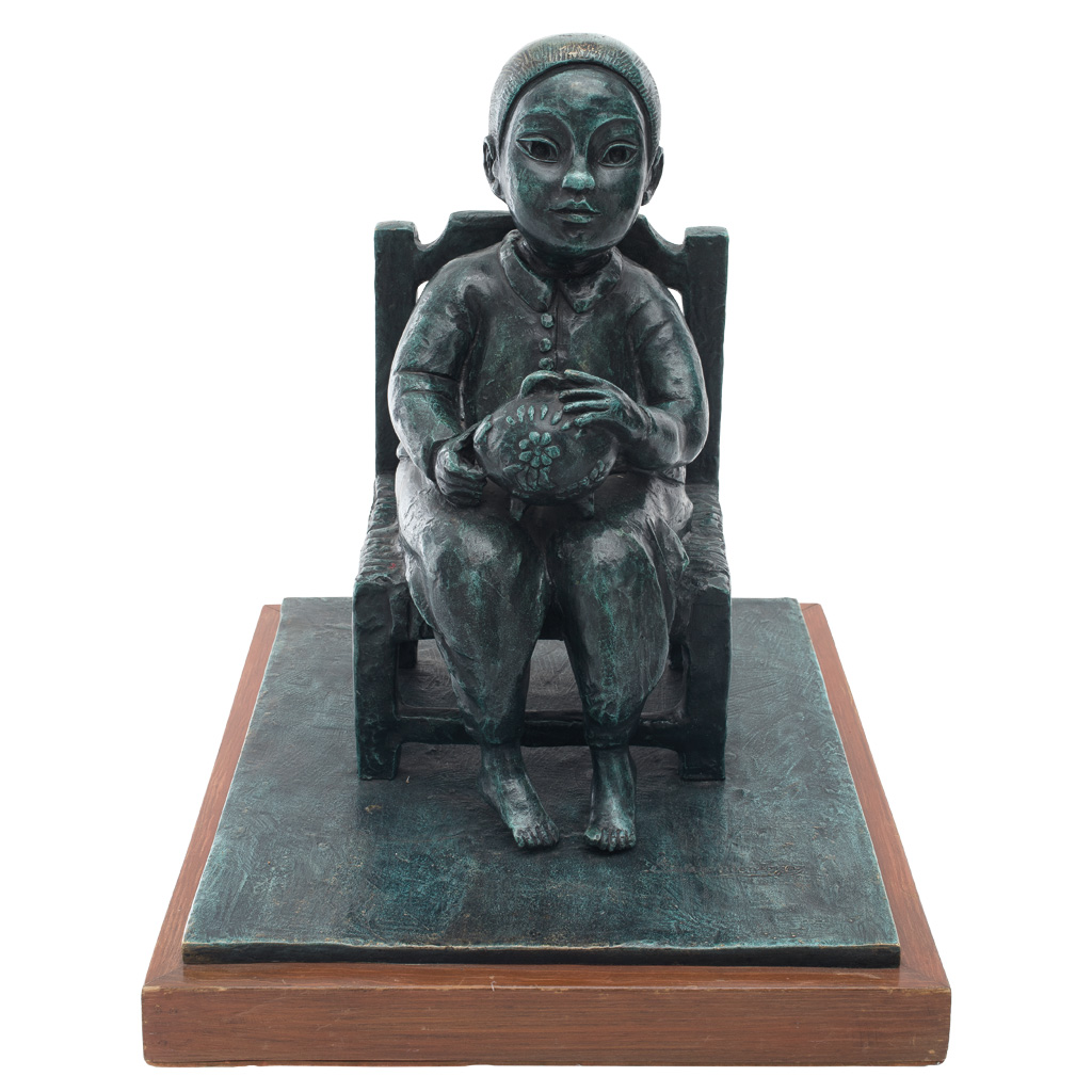 Subasta 767, Lote # 194 GUSTAVO MONTOYA (Ciudad de México, 1905 - Ciudad de México, 2003) Alcancía, de la colección Niños Mexicanos, 2000 Firmada Escultura en bronce con pátina verde Con certificado de autenticidad del artista en el que valida que supervisó y aprobó la realización de la escultura, noviembre de 2000, dicho certificado está ilustrado con una escultura cuya pátina difiere ligeramente en color a la que aquí se presenta. Con certificado de Galería Enrique Jiménez Maren, mayo de 2013. Agradecemos a Rosa Elena Montoya, hija de Gustavo Montoya, por la verificación de autenticidad de esta obra, abril de 2013. Esta escultura es la número 6 de una edición de 9. Presenta ligeros detalles de conservación en la base y pátina. 52 x 43 x 52 cm USD $3,500-$4,700 Estimado $60,000-80,000