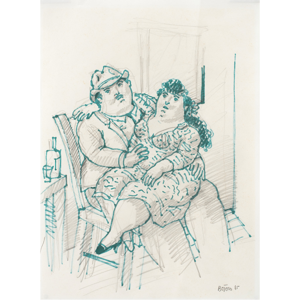 Subasta 767, Lote # 141 FERNANDO BOTERO (Medellín, Colombia, 1932 - ) Sin título Firmado y fechado 85 Lápiz de grafito y marcador sobre papel Procedencia: adquirido en Loudmer Scp., París, subasta del 18 de febrero de 1990. Con certificado de autenticidad del artista. El dibujo a marcador está realizado por el reverso del papel por lo que las líneas que crean el efecto de color verde en la cara frontal se deben a la tinta absorbida por el papel. Es uno de los artistas plásticos más reconocidos a nivel mundial, considerado el creador vivo latinoamericano más cotizado del mercado actual. Ha logrado que su lenguaje artístico, plasmado en dibujos, pinturas y esculturas, sea reconocido por niños y adultos de todo el mundo. Botero bebe de las tradiciones artísticas occidentales, inspirándose en obras de antiguos maestros como Goya, Velázquez y Piero della Francesca, fusionándolas con la cultura colombiana contemporánea. Su estilo decididamente naïf resalta el inestable equilibrio entre el humor y la crítica social, entre el arte y la política. Fuente consultada: BARNES, Rachel et ál. Arte del siglo XX. México. Plaza Janés, 1999, Pág. 55. 47.2 x 34 cm USD $26,500-$29,400 Estimado $450,000-500,000