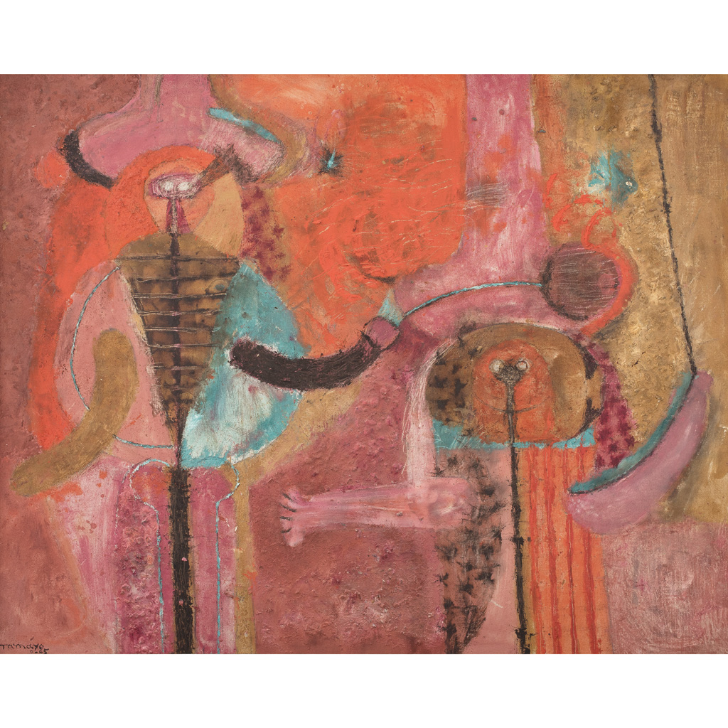 Subasta 767, Lote # 135 RUFINO TAMAYO (Oaxaca de Juárez, México, 1899 - Ciudad de México, 1991) Pareja, Couple Firmado y fechado O-65 Óleo y arena sobre tela Publicado en: Rufino Tamayo. Zúrich. Galerie Semiha Huber, 1965, catalogado 3. PIANZOLA, Maurice et ál.Le visage de l'homme dans l'art contemporain. Ginebra. Musée Rath, 1967, con el título "Le couple". Exhibido en: "Rufino Tamayo", Galerie Semiha Huber, Zúrich, Suiza, muestra presentada de noviembre a diciembre de 1965. "Le visage de l'homme dans l'art contemporain". Musée Rath - Genève, Ginebra, Suiza, muestra presentada de julio a septiembre de 1967. Con etiquetas de: - Museo Rufino Tamayo. - Musée d'art et d Historie Genéve, exposición "Le visage de l'homme dans l'art contemporain". - Mary-Anne Martin fine art, New York. - Galerías Iturbide con el título "Dos figuras (Couple)". "Considero un gran honor exhibir la importante obra de Rufino Tamayo en Suiza por primera vez. "Entre los artistas mexicanos, Tamayo es único y diferente a los demás. El realismo del arte mexicano, la fantasía, la poesía y los colores brotan de las profundidades de su alma humana. "Tamayo no es sólo el más representativo de los artistas contemporáneos de México, su lenguaje es reconocido internacionalmente. Sus obras han sido atesoradas por coleccionistas de arte y museos de todo el mundo. "Quisiera expresar mi agradecimiento a Olga y Rufino Tamayo, quienes amablemente apoyaron en la realización de esta exposición en mi galería". Semiha Huber, 1965. Fuente consultada: HUBER, Semiha. Rufino Tamayo. Zúrich. Galerie Semiha Huber, 1965. 81.5 x 101 cm USD $820,000-$1,100,000 Estimado $14,000,000-18,000,000