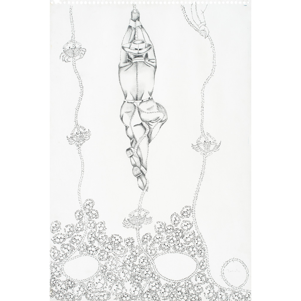 Subasta 767, Lote # 138 FRANCISCO TOLEDO (Juchitán, Oaxaca, 1940 - ) Hombre huyendo de los cangrejos Firmada a lápiz Tinta sobre papel de sketchbook El pintor, grabador, escultor, ceramista, dibujante, promotor cultural y defensor del patrimonio histórico y natural llegó nostálgico a su cumpleaños 75 el pasado 17 de julio. En entrevista Francisco Toledo se rió cuando se le preguntó por qué huye de la fama: "La fama tiene ventajas, pero es incómoda. La ventaja es que te sientes querido por la gente. Al menos mi fama aquí en la ciudad de Oaxaca, en las calles por donde camino, siempre hay gente que te saluda bien. Es una fama chiquita, pero es buena en el sentido de que hay un afecto. Y, bueno, las desventajas son las entrevistas, por ejemplo". Fuente consultada: BAUTISTA, Virginia. "Triste cumpleaños 75: entrevista a Francisco Toledo". México. Periódico Excelsior, sección Expresiones, 17 de julio de 2015. 46 x 31 cm USD $7,600-$11,800 Estimado $130,000-200,000