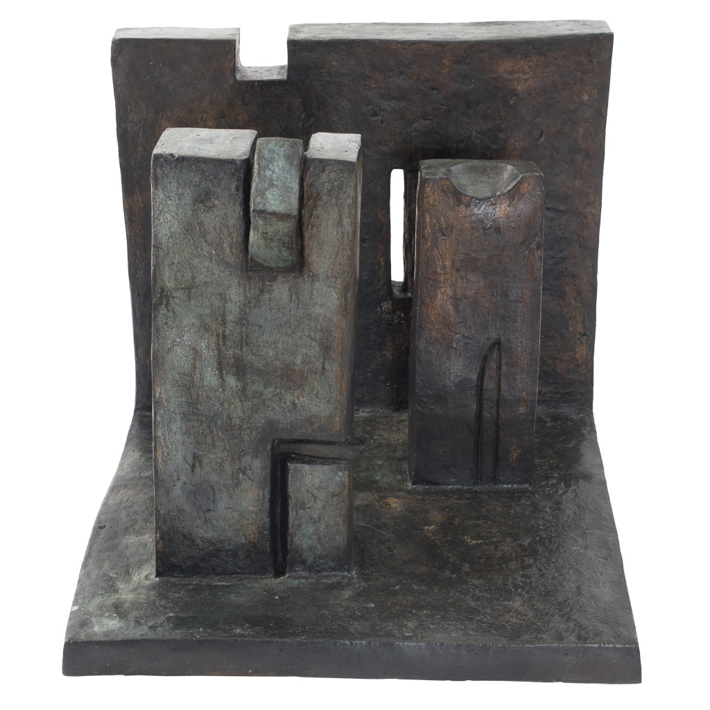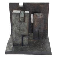 Subasta 767, Lote # 147 FERNANDO DE SZYSZLO (Lima, Perú, 1925 - ) Cámara ritual, del proyecto Libertad en bronce, 1995 Firmada Escultura en bronce 5 / 6 Con certificado de Impronta Editores firmado por el artista, junio de 1996. Publicada en: TOVAR Y DE TERESA, Rafael et ál. Libertad en bronce. México. Impronta Editores, 1999, pp. 378 y 379. "Desde el mismo punto de partida que Tamayo en los años treinta y cuarenta, es decir, desde la pintura metafísica pero sondeando las correspondencias posibles de sus lenguajes con los del arte inca, Fernando de Szyszlo ha creado su propio imaginario capaz de evolucionar y responder a tantas interrogantes como lo exijan los 'tiempos'. Y en su escultura, conclusiones filosóficas personales reducen al mínimo su manifestación física y enriquecida por concentración de su capacidad simbólica: un geometrismo tan emparentable con el de la Escuela del Sur como el de las perfectas arquitecturas del espíritu de su propia cultura ancestral, que responde con su propio lenguaje a la modernidad". Luis Carlos Emerich. Fuente consultada: TOVAR Y DE TERESA, Rafael et ál. Libertad en bronce. México. Impronta Editores, 1999, Pág. 365. 70 x 77 x 70 cm USD $10,600-$14,700 Estimado $180,000-250,000