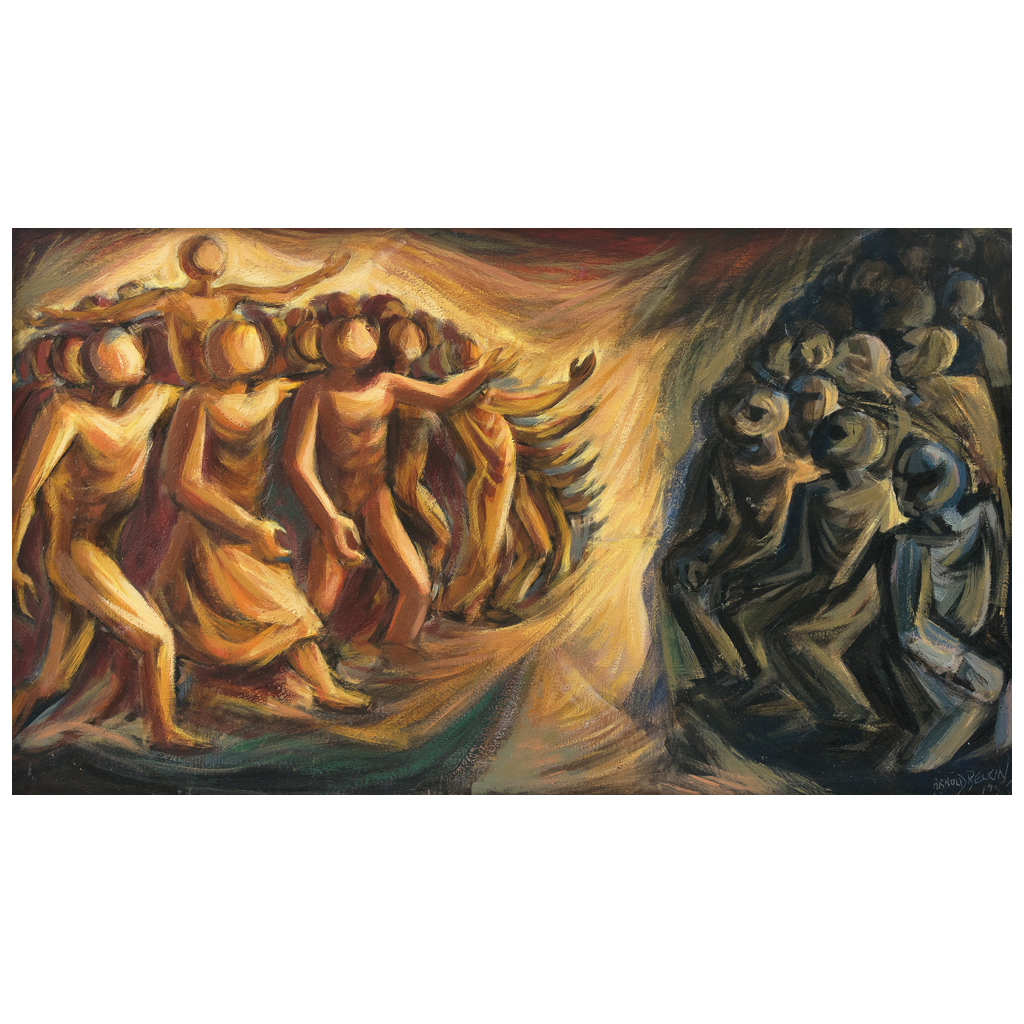 Subasta 825, Lote # 155 ARNOLD BELKIN (Alberta, Canadá, 1930 - Ciudad de México, 1992) Estudio Firmado y fechado 1957 Óleo sobre masonite Agradecemos a Ariela Belkin, hija del artista, por la verificación de autenticidad de esta obra, enero de 2017. Habiendo descubierto la pintura de Diego Rivera a través de la revista Time, llegó a la Ciudad de México a los 18 años para estudiar en La Esmeralda. Después de trabajar como asistente de David Alfaro Siqueiros en los 50, empezó su labor como muralista y fue conocido como 'el hijo canadiense del muralismo mexicano'. El hombre como centro de la creación, el hombre en armonía con el universo, o bien como protagonista de las grandes batallas que modelarían el curso de la historia son las constantes en la obra de Belkin, quien siempre se reveló enérgicamente en contra de las injusticias políticas y sociales. Fuente consultada: GARCÍA DE KRINSKY, Emma Cecilia et ál. Homenaje a Arnold Belkin. México. Universidad Nacional Autónoma de México, 1998. pp. 14-17. 50 x 87 cm USD $5,150-$9,250 Estimado $ 100,000-180,000