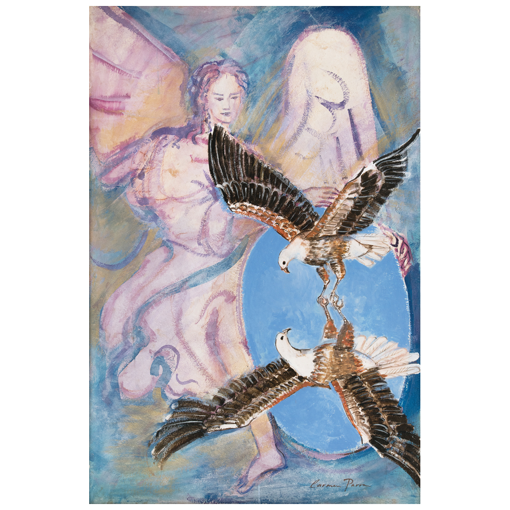 Subasta 825, Lote # 190 CARMEN PARRA (Ciudad de México, 1944 - ) San Juan de Dios en la Villa de Atlixco III, 2003 Firmado Acrílico sobre papel amate sobre madera Con constancia de autenticidad de El Aire Centro de Arte firmada por la artista. A partir de 1982, su producción artística dio un giro, comenzando a tratar temas más decididamente mexicanos, con un sentido tanto antropológico como reivindicativo: la migración de la mariposa monarca, la hagiología en la pintura barroca mexicana, los hallazgos del Templo Mayor, la riqueza artística de la Catedral de México, el águila real… que intercala con otros proyectos que dan continuidad a su primera etapa artística. El estilo pictórico que identifica a Carmen Parra es una afortunada síntesis entre la tradición barroca novohispana y la modernidad pictórica, entre cuyos referentes se cuentan Picasso, Braque, Matisse y Chagall. 120 x 80 cm USD $5,150-$7,700 Estimado $ 100,000-150,000