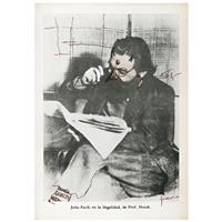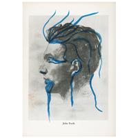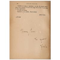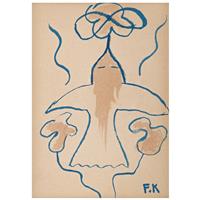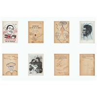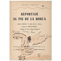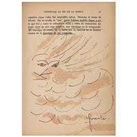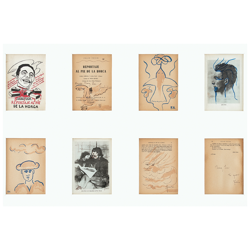 Subasta 825, Lote # 163 FRIDA KAHLO (Ciudad de México, 1907 - Ciudad de México, 1954) Sin título (intervenciones dibujísticas sobre un libro), ca. 1953 Firmados Seis dibujos a tinta azul y sepia e inscripciones diversas sobre papel impreso Piezas: 8, enmarcadas juntas Con ensayo documental del Profesor Luis-Martín Lozano, septiembre de 2016. Se trata de una publicación de época referente a una traducción al español de los escritos póstumos de Julio Fucik editado por el Fondo de Cultura Popular en agosto de 1952. El compendio de textos, bajo el título "Reportaje al pie de la horca" fue editado en México con una traducción del checo por Libuse Prokopova, un poema de Pablo Neruda dedicado a Julio Fucik y una portada diseñada por Diego Rivera. En las páginas del ejemplar que conforman este lote hay tres dibujos en tinta, dos de ellos realizados en tinta color azul y que ostentan las iniciales F.K. y un tercero en color sepia con una firma autógrafa que se lee "Fridu". También, consta de dos impresiones de fotografías en blanco y negro de Fucik, las cuales están intervenidas con tinta color sepia y azul, ambas con grafismos. Asimismo, en la portadilla interior hay una dedicatoria con dibujos y grafología que se lee "Querido Chong Lee. Fridu Kahlo" y por último la portada con la ilustración de Diego. Frida entabló amistad con el escritor Miguel N. Lira cuando se conocieron en la Escuela Nacional Preparatoria y a quien frecuentó como amigo de "Los cachuchas", desde entonces ambos mantuvieron un intercambio de libros sobre arte y literatura. En 1927, Frida ilustró el segundo libro de poemas de Lira. Precisamente, por aquella estrecha relación, todo indica que el libro que reúne los escritos póstumos de Julio Fucik fue un regalo de Frida a Lira en 1953; en su portadilla le escribió una dedicatoria de puño y letra, en la cual se advierte la desesperanza y estado anímico que atravesaba la pintora ese año (mismo en que sufrió la amputación parcial de la pierna derecha, lo que significó el principio del fin), junto a la dedicatoria, perfiló un rostro femenino de cuyo ojo penden lágrimas que corren a la comisura de una boca cuyos labios enmarcan la tipografía de "MEXICO" y el año 1952. Entre los tres dibujos autónomos realizados en páginas en blanco, uno refiere a una paloma de la paz que vuela hacia el signo del infinito, este tema y tipo de trazos aparecieron más de una vez en los dibujos que Frida realizó en torno a los primeros años de la década de los 50. Fue una iconografía proveniente de su estado de ánimo y convicciones políticas del momento, entre su sufrimiento físico y los difíciles enfrentamientos comunistas. Por todo lo sucedido, fue una etapa en la que Frida se preocupó intelectualmente por la historia y desarrolló interés por la paz mundial. Junto al prólogo aparece un segundo dibujo, nuevamente en trazos de tinta azul claro que fluyen juguetonamente y que muestran un retrato juvenil de Miguel N. Lira con sombrero de torero, en cuyos rasgos caricaturescos, Frida conservó las espesas cejas, labios carnosos, nariz perfilada y mentón de poeta. El tercero y último de los dibujos autónomos está realizado en tinta color sepia, es la representación de Eolo señor de los vientos, rodeado de turbulentos remolinos. El dibujo se encuentra al final del capítulo de "La 400" en el reporte de Fucik "Al pie de la horca" y alude al fortuito destino de aquellos que salvaban de sus captores pudiendo escapar de la muerte. Estos dibujos son todos claros ejemplos de cómo el trabajo artístico de Frida Kahlo se desarrollaba en la coyuntura de los avatares de su existencia; como sucede en muchas de sus obras, en los dibujos está imbricado el estilo de trabajo de la artista con su personalidad; pocos creadores en la historia del arte lograron una simbiosis tal, entre vida y obra, como Frida Kahlo. No se trata de estudios o bocetos para una obra, sino de un ejercicio creativo autónomo que fluye con la inmediatez de los dibujos y acuarelas que encontramos, por ejemplo, en las páginas del diario que escribió entre los años de 1944 y 1954. Poseen la libre espontaneidad de la asociación de ideas que detectamos en varios dibujos a partir de 1946, algunos bajo la impronta del surrealismo. Profesor Luis-Martín Lozano. Fuente consultada: LOZANO, Luis-Martín. "Estudio de la obra Intervenciones dibujísticas sobre un libro". México. Septiembre de 2016. 18.3 x 14 cm cada uno, 72.5 x 105.5 cm medidas totales del marco USD $61,550- $92,310 Estimado $ 1,200,000-1,800,000