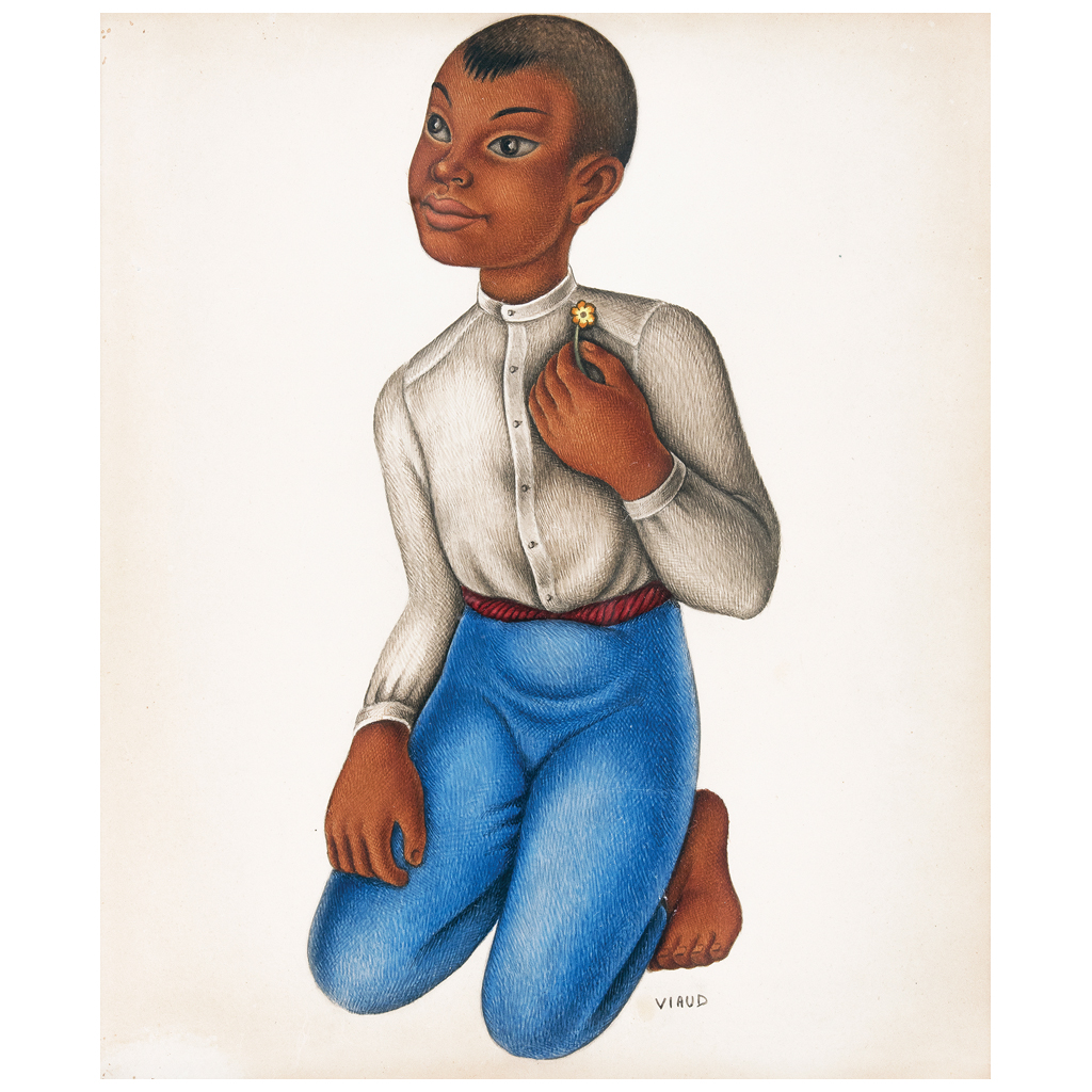 Subasta 825, Lote # 176 EMILIO BAZ VIAUD (Ciudad de México 1918 - 1991) Niño indígena, ca. 1938 Firmada Acuarela aplicada al pincel seco sobre papel Procedencia: adquirida directamente al artista. Emilio Baz Viaud ingresó en 1938 a la Academia de San Carlos donde estudió Arquitectura, sin embargo su verdadero interés siempre fue la pintura. Durante sus estudios conoció a Manuel Rodríguez Lozano, quien lo guió a lo largo de su real vocación como artista. En esta época conoció a José Gómez Rosas "El Hotentote", con quien mantuvo una relación amorosa. En 1951 realizó su primera exhibición colectiva, junto a eminentes artistas como David Alfaro Siqueiros y Diego Rivera. Su vida fue totalmente bohemia, lo que lo llevó a experimentar artísticamente sin ataduras. Su meticulosa técnica "trompe-l'oeil", fue elogiada por sus colegas y críticos, un estilo logrado aplicando pintura al óleo sobre superficies secas. Su producción artística más conocida fue realizada en los primeros años de la década de los 50, ya que para el inicio de los 60 tuvo un periodo abstracto, época en la cual entró a un monasterio en Cuernavaca para recibir terapias psicoanalíticas. Fuente consultada: sitio del Museo Colección Blaisten www.museoblaisten.com 38.7 x 34 cm USD $6,700-$9,250 Estimado $ 130,000-180,000