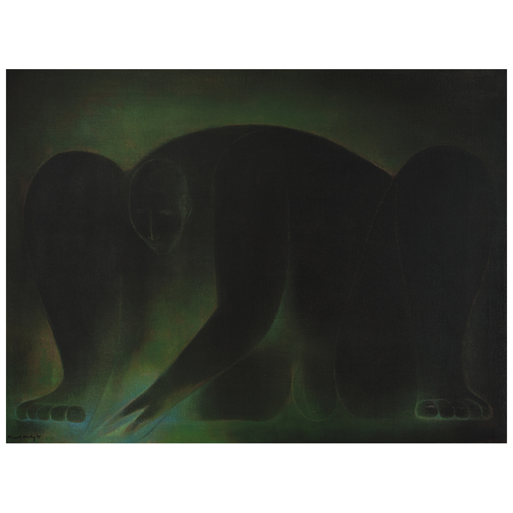 Subasta 825, Lote # 85 RICARDO MARTÍNEZ (Ciudad de México, 1918 - Ciudad de México, 2009) Hombre con agua Firmado y fechado 74 Óleo sobre tela Esta obra será registrada para el Catálogo Razonado del Dr. Mark Ruben con núm. RM-74035 Con etiqueta de Christie's. Ricardo Martínez, en su aprendizaje apasionado y solitario (él nunca asistió a escuela o academia alguna, careció incluso de compañía con quien comentar o compartir sus búsquedas y sus hallazgos), supo desde los comienzos aquellos principios fundamentales. Indagó durante años las causas y los efectos de la línea y el color y las disposiciones espaciales. Especuló, experimentó con ellos durante años de esfuerzo encarnizado y tenaz, fue despojándose en sus obras de lo que no fuera, de acuerdo con sus interiores necesidades, cabalmente esencial. "La luz se toca con la tiniebla para generar un ámbito de seres henchidos de energía que contienen la esencia de lo humano. Figuras que yacen, se yerguen y permanecen sedentes, suspendidas en el tiempo. Cuerpos de enorme contundencia y simultáneamente difusos, de una inmaterialidad rotunda, inasibles y oscuros a pesar de la inmovilidad inquietante con la que iluminan el espacio infinito". Rafael Tovar y de Teresa. Fuente consultada: BONIFAZ NUÑO, Rubén. Ricardo Martínez. México, Fondo Editorial Panorama, 1994, pp. 5 y 35. 85 x 105 cm USD $61,550-$82,100 Estimado $ 1,200,000-1,600,000