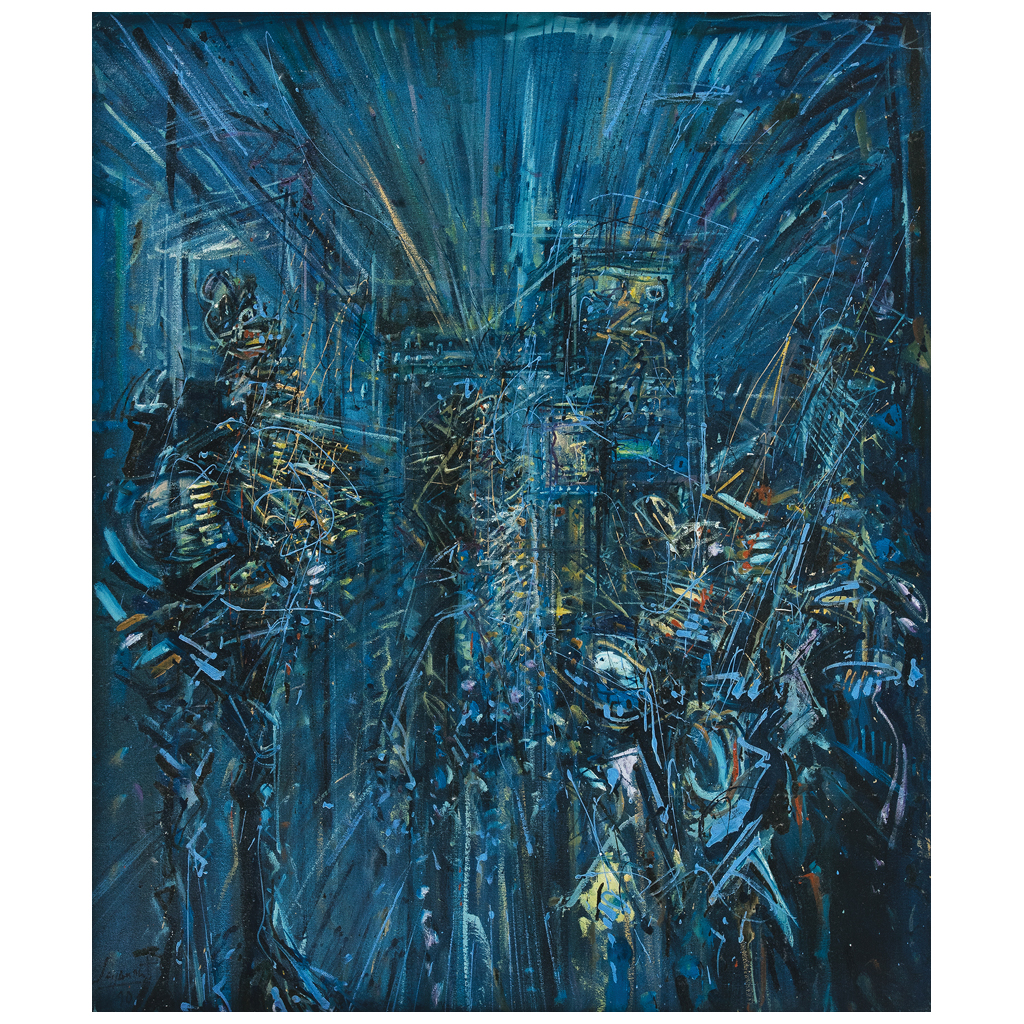 Subasta 825, Lote # 98 JAVIER VÁZQUEZ "JAZZAMOART" (Irapuato, Guanajuato, 1951 - ) Interior azul Firmado y fechado 1990 Óleo sobre tela Con certificado de autenticidad del artista. Javier Vázquez Estupiñán adoptó en 1974 el seudónimo de Jazzamoart (jazz, amor y arte). Con estudios en la Academia de San Carlos, a partir de la década de los ochentas, su estilo definido y muy personal lo ubicaron en la escena de la plástica latinoamericana. El escritor Carlos Montemayor lo definió como el tercer grande de los pintores del Bajío, junto a Diego Rivera y José Chávez Morado, al respecto dijo: "Rivera y Chávez Morado estuvieron atentos al paisaje y a numerosos motivos del México popular, Jazzamoart también lo está, pero al paisaje social que se descubre y emerge desde un motivo central del México que sigue siendo asimismo popular: la música". En 1990 instaló un taller en París y en México expuso en el Museo de Arte Moderno y en el Museo Nacional de la Estampa. Ese mismo año su obra fue elogiada por la crítica de arte Teresa del Conde y recibió el Premio del VI Festival del Centro Histórico de la Ciudad de México. Sus improvisaciones visuales y escenografías han acompañado en el escenario a los principales exponentes del jazz mexicano y estadounidense. Como ilustrador y baterista ha trabajado en varios libros y discos. Jazzamoart ha mostrado su trabajo en más de quinientas exposiciones colectivas e individuales en museos y galerías de México, Latinoamérica, Estados Unidos, Canadá, Europa, Corea del Sur y Japón. Entre los reconocimientos a su trayectoria destacan haber sido miembro del Sistema Nacional de Creadores de Arte del FONCA-CONACULTA y el homenaje a su trayectoria por parte de la Universidad de Guanajuato que recibió el pasado 18 de marzo, en la sala Adamo Boari del Palacio de Bellas Artes. Fuentes consultadas: sitio oficial del artista www.jazzamoart.com y MUÑOZ, Miguel Ángel et ál. Jazzamoart. Sólo a fuerza de pintar. México. Edición Nora Smith Castillo, Tiempo Imaginario, 2014, pp. 303-307. 127 x 110 cm USD $7,700-$10,260 Estimado $ 150,000-200,000