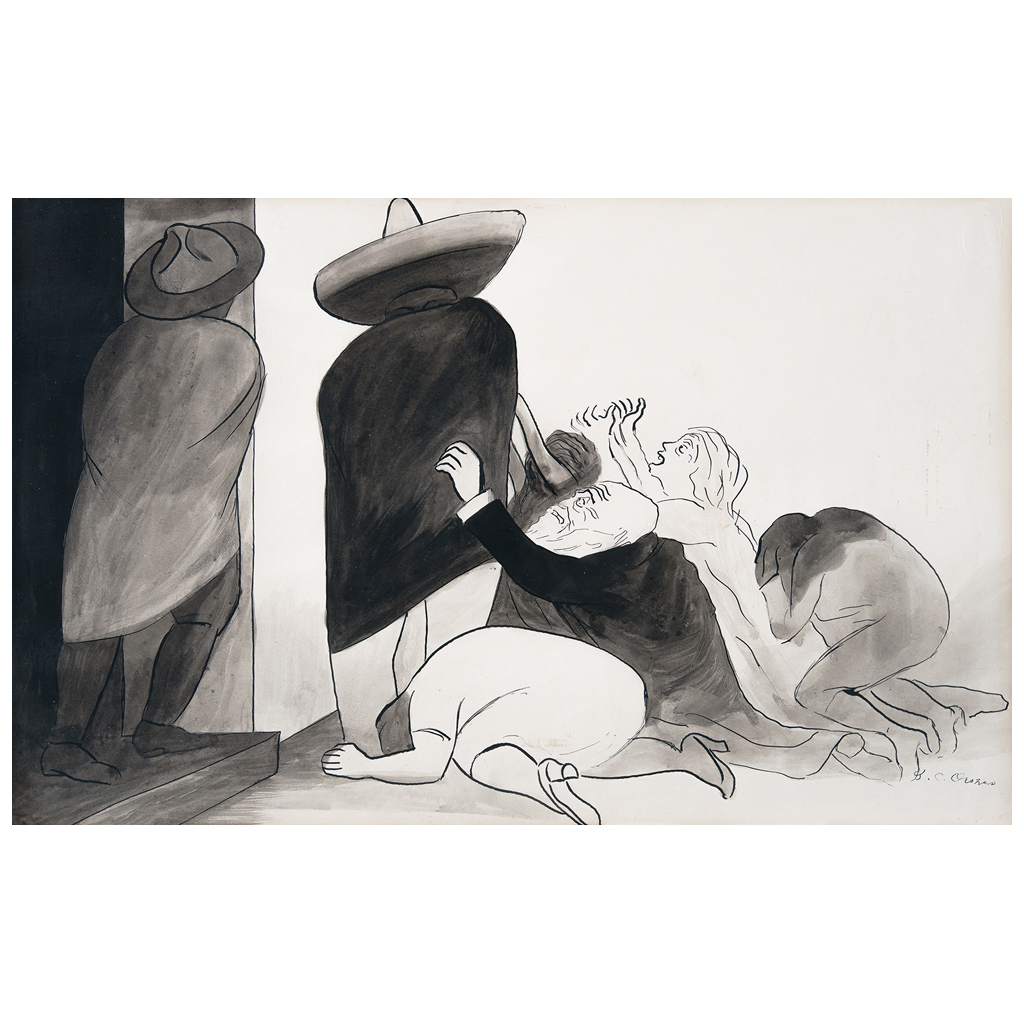 Subasta 825, Lote # 161 JOSÉ CLEMENTE OROZCO (Zapotlán actual Ciudad Guzmán, Jalisco, 1883 - Ciudad de México, 1949) La súplica, 1916 Firmada Tinta sobre papel Con etiquetas del Instituto Nacional de Bellas Artes, Oficina de Registro de Obra y de Mexican Modern Art, INBA. La Revolución Mexicana fue el conflicto político y social más importante de principios del siglo XX en México. Orozco fue uno de los dibujantes más asiduos y puntuales que atestiguó mediante su obra los hechos sucedidos en aquella época. Su obra fue vasta y diversa, pues además de murales, trabajó la pintura de caballete, el dibujo y la gráfica sobre temas asociados al movimiento revolucionario, destacando su postura radical e inconformidad por la situación del país. Esta primera mitad de siglo fue complicada para muchos artistas; para Orozco fue una etapa de cambios familiares y el comienzo de lo que sería su extraordinaria carrera. Su padre murió en 1911, desde entonces trabajó para su sustento. En 1916 decoró el café "Los Monotes", propiedad de su hermano y realizó su primera exposición individual en la Librería Biblos de la Ciudad de México. Al año siguiente viajó a Estados Unidos, residiendo en San Francisco y Nueva York, donde trabajó pintando carteles de cines. "Orozco fue el primer gran pintor mexicano que se acercó al pueblo". David Alfaro Siqueiros.Fuente consultada: FERNÁNDEZ. Justino. José Clemente Orozco. México. Librería Porrúa, 1942, pp. 37-39. 29 x 46.5 cm USD $24,610-$30,800 Estimado $ 480,000-600,000