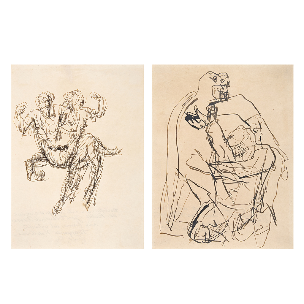 Subasta 825, Lote # 154 JOSÉ CLEMENTE OROZCO (Zapotlán actual Ciudad Guzmán, Jalisco, 1883 - Ciudad de México, 1949) a) ¡Ah! ¿Eres tú?, ca. 1945 b) Pareja siamesa centauro, ca. 1947 Sin firma Tinta sobre papel Piezas: 2 Ambas certificadas al reverso de forma autógrafa por Margarita Valladares de Orozco. Las dos con dictámenes de autenticidad de la Fundación José Clemente Orozco A.C., firmados por Clemente Orozco V. Procedencia: adquiridas a la colección de la familia del artista; provienen originalmente del taller de José Clemente Orozco. Colección privada. Sobre la colección de dibujos del Maestro José Clemente Orozco incluida en los lotes 154, 156, 158, 159 y 160: "José Clemente Orozco mencionaba: '¿Acaso no es posible crear una obra maestra con un lápiz cualquiera sobre cualquier papel?' Y Orozco lo demostró plenamente en la mayoría de estos dibujos. Quien quiera que sea el dueño particular va a poseer algo invaluable y singular: la creación directa, concreta de una idea estática. Ningún particular posee semejante acervo. Solamente las instituciones o los edificios donde dejó su obra mural. Por otra parte, estos dibujos que provienen del taller de Orozco y pasaron a ser propiedad de la familia, le sirvieron al pintor para realizar obras independientes de los murales y son la clave para entender el proceso creativo de estas y otras pinturas. Si tenemos en cuenta el número de coleccionistas, es claro que sería imposible que alguno de ellos poseyera siquiera alguno de estos dibujos. Se precisa de una gran sensibilidad y criterio estético para valorar lo excepcional de tener esta oportunidad". Clemente Orozco Valladares. 27.4 x 21 cm cada una USD $4,110-$6,160 Estimado $ 80,000-120,000