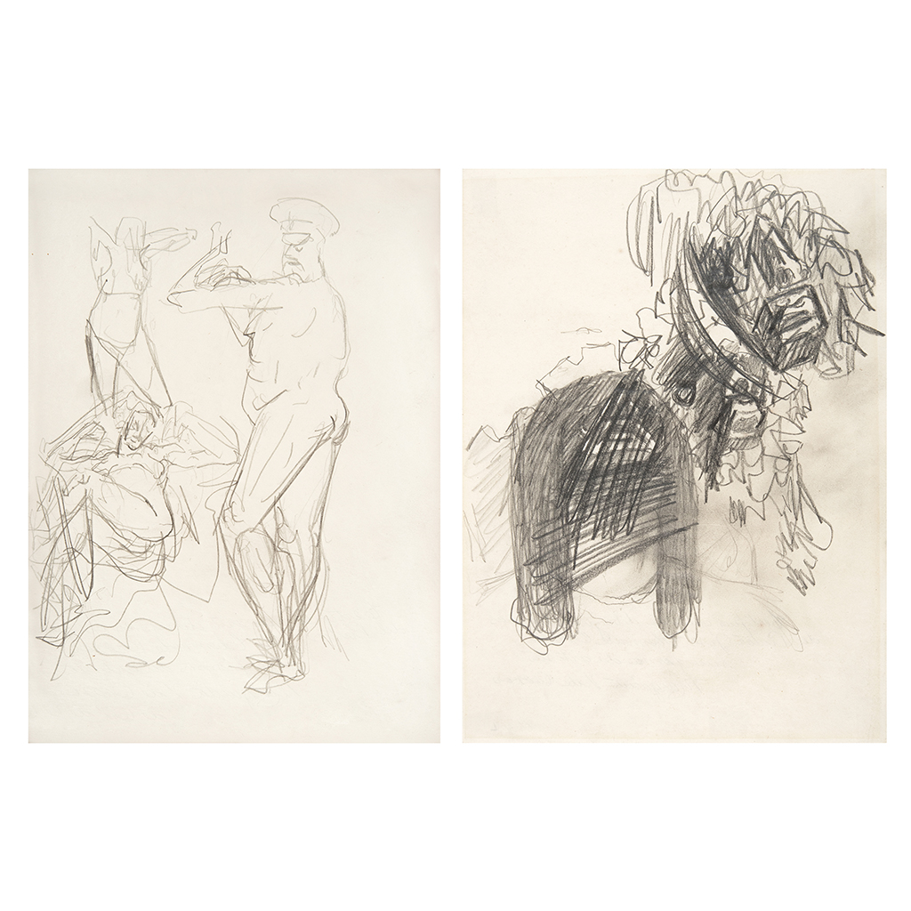 Subasta 825, Lote # 160 JOSÉ CLEMENTE OROZCO (Zapotlán actual Ciudad Guzmán, Jalisco, 1883 - Ciudad de México, 1949) a) Tres figuras, una pequeña al fondo y general de pie, 1946 b) Tres proyectos de cabezas, ca. 1948 Sin firma Lápiz de grafito sobre papel Piezas: 2 Ambos certificados al reverso de forma autógrafa por Margarita Valladares de Orozco. Los dos con dictámenes de autenticidad de la Fundación José Clemente Orozco A.C., firmados por Clemente Orozco V. Procedencia: adquiridos a la colección de la familia del artista; provienen originalmente del taller de José Clemente Orozco. Colección privada. a) se encuentra enmarcado, por lo que no se puede apreciar la certificación, pero está indicada en el certificado. 27.5 x 20 cm cada uno USD $4,110-$6,160 Estimado $ 80,000-120,000