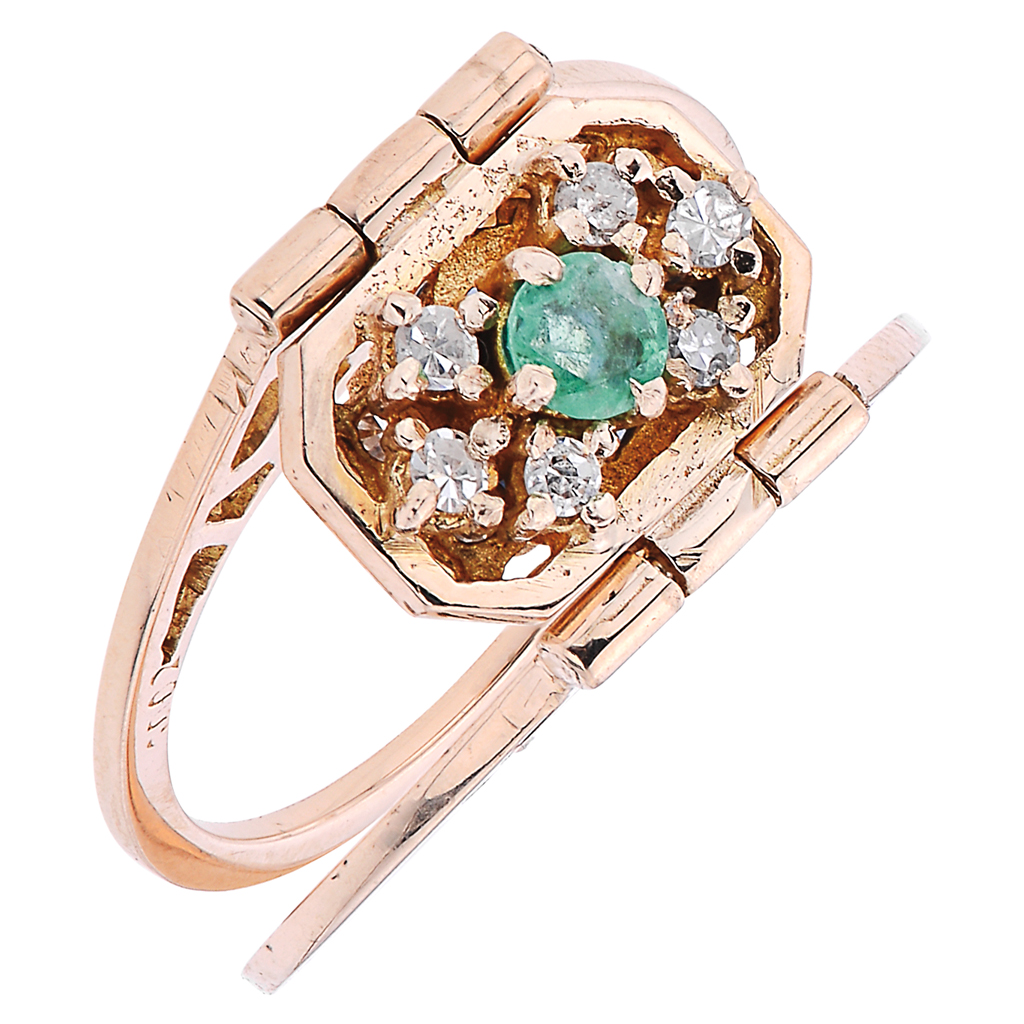 Subasta 856, Lote # 208 ANILLO CON ZAFIRO, ESMERALDA Y DIAMANTES EN ORO AMARILLO DE 14K Anillo de doble vista con zafiro y diamantes en un lado y esmeralda con diamantes al reverso. Peso: 4.7 g. Talla: 5 1/4 1 Zafiro corte oval facetado ~0.28 ct 1 Esmeralda corte redondo facetado ~0.14 ct 10 Diamantes corte 8x8 ~0.25 ct Estimado $ 5,000-6,000