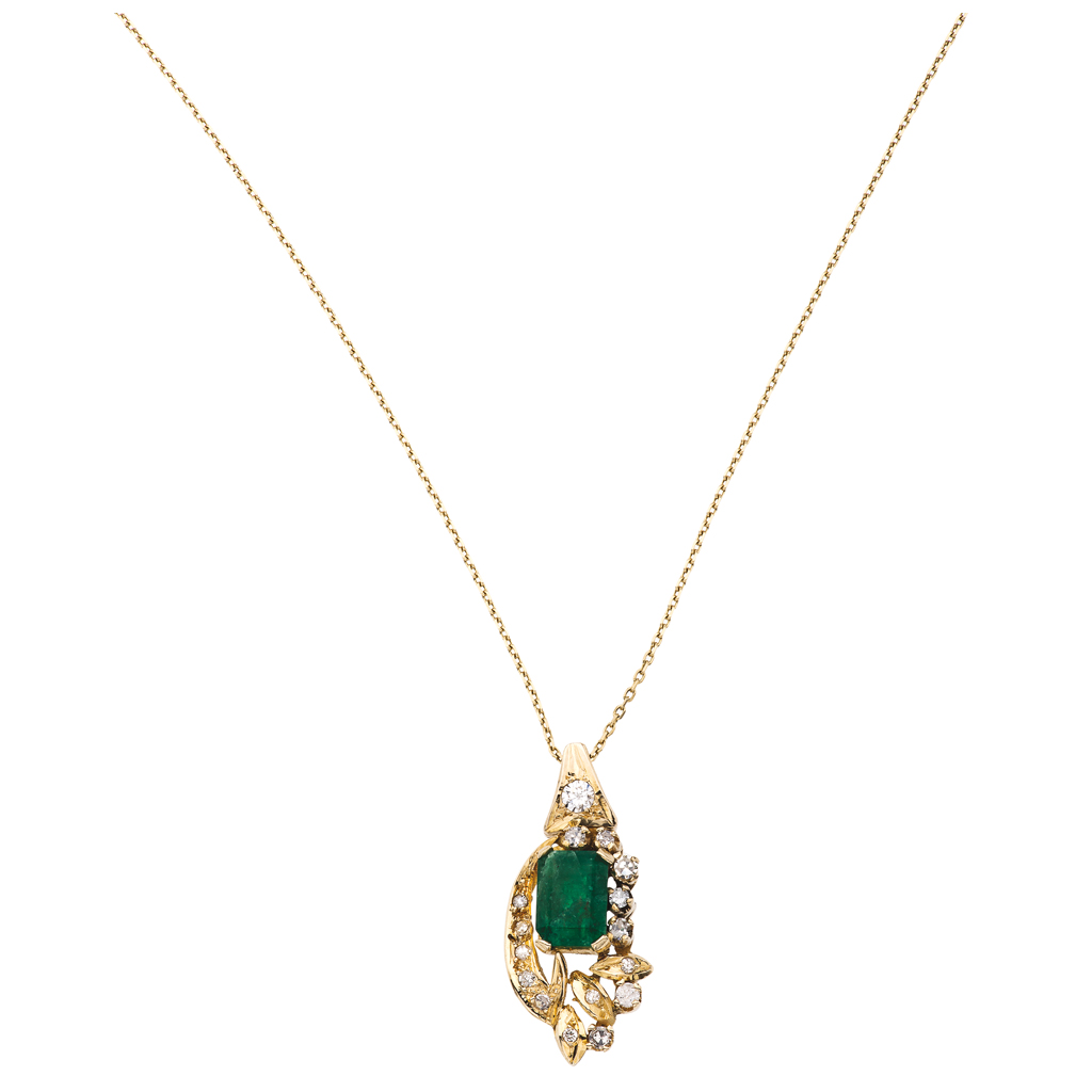 COLLAR Y PENDIENTE CON ESMERALDA Y DIAMANTES EN ORO AMARILLO DE 14K