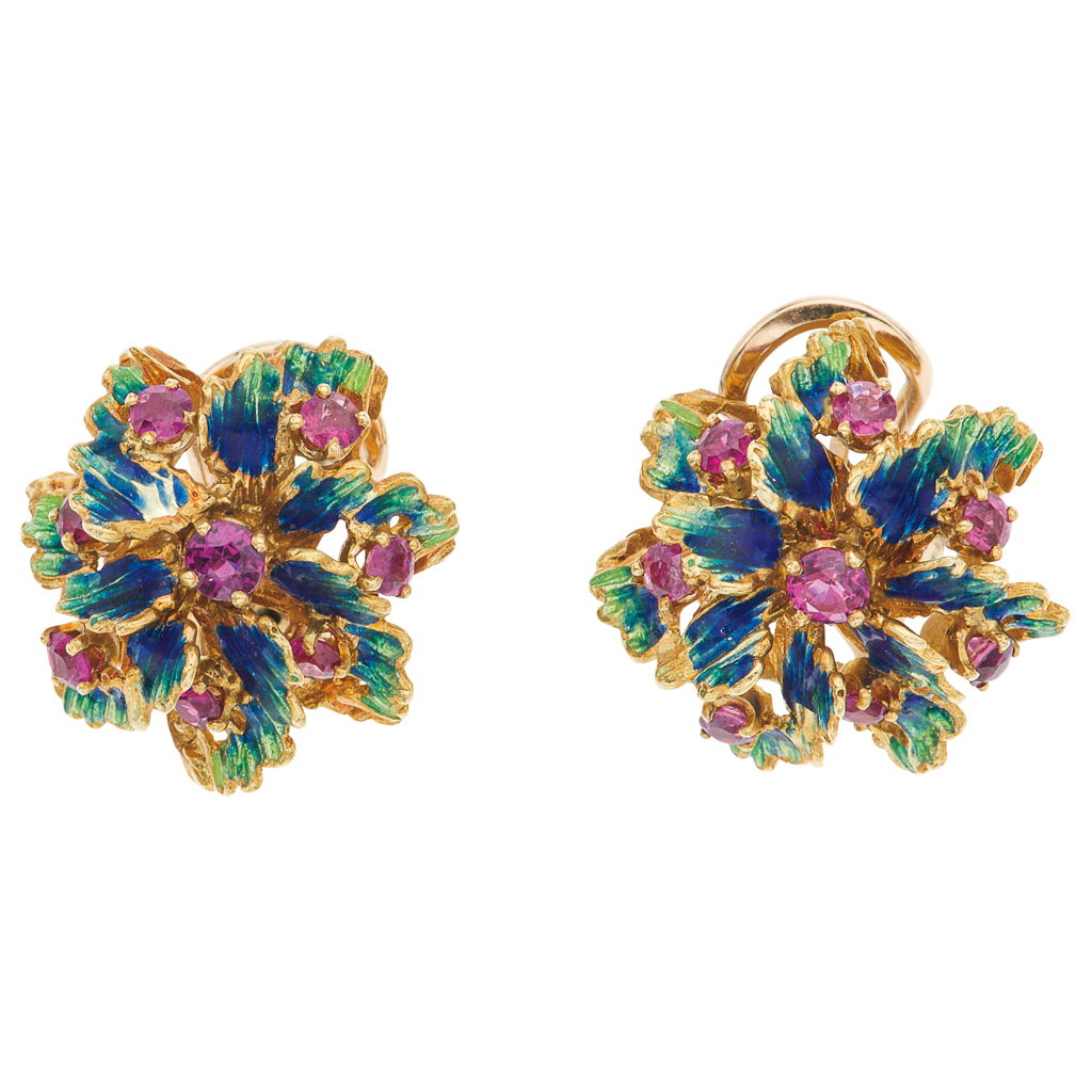 Subasta 856, Lote # 201 PAR DE ARETES CON TURMALINAS Y ESMALTE EN ORO AMARILLO DE 18K DE LA FIRMA CHERNY Diseño floral con turmalinas y pétalos con aplicaciones de esmalte azul y verde. Poste y raqueta. Peso: 11.4 g. Diámetro: 1.8 cm 8 Turmalinas corte redondo facetado ~0.45 ct Estimado $ 12,000-14,000
