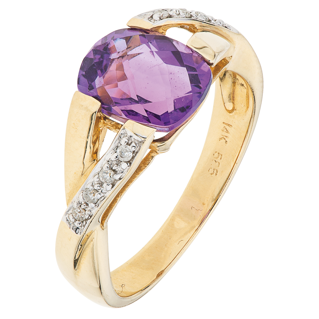Subasta 856, Lote # 191 ANILLO CON AMATISTA Y DIAMANTES EN ORO AMARILLO DE 14K Con una amatista y diamantes engastados en vistas blancas a los costados. Peso: 3.6 g. Talla: 7 1 Amatista corte rectangular facetado ~2.20 ct 8 Diamantes corte brillante ~0.08 ct Estimado $ 6,000-7,000