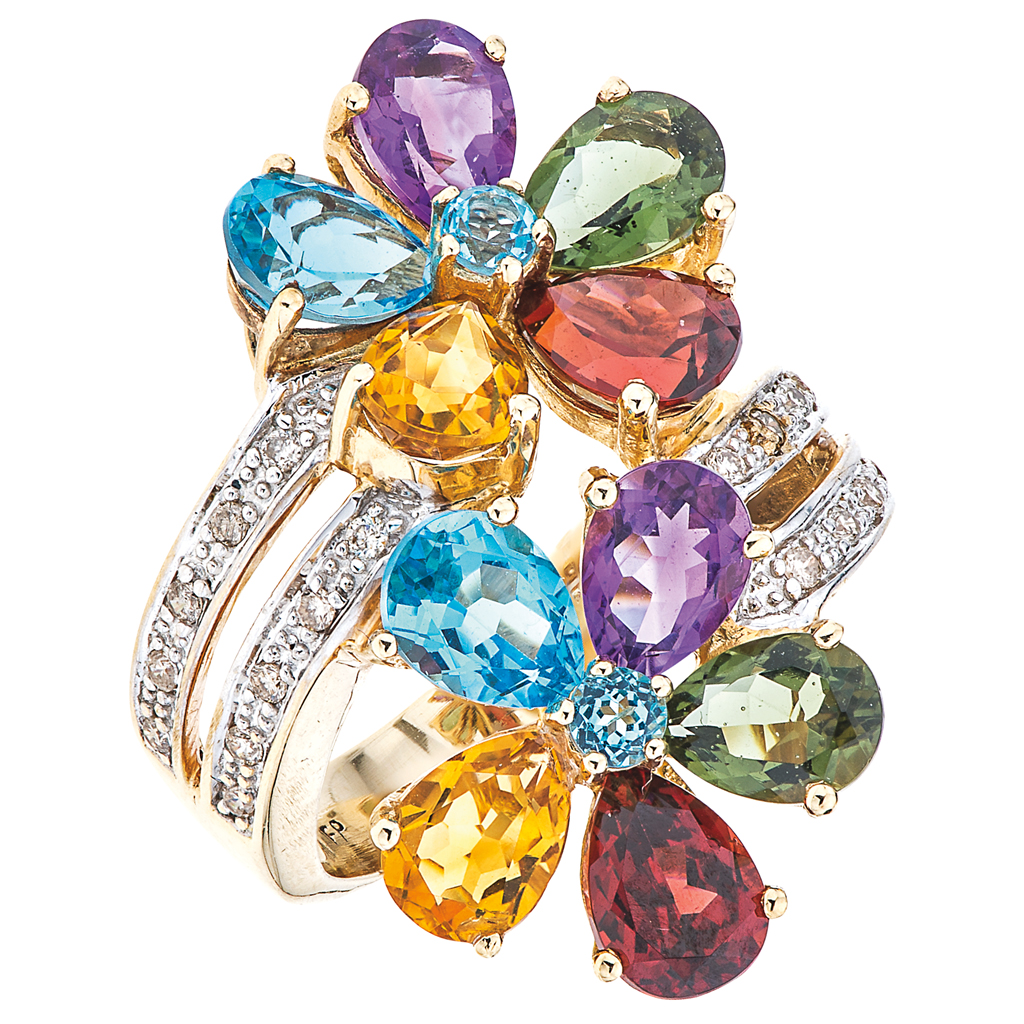 Subasta 856, Lote # 197 ANILLO CON TOPACIOS, OLIVINOS, CITRINAS, AMATISTAS, GRANATES Y DIAMANTES EN ORO AMARILLO DE 14K Con flores de gemas semipreciosas e hileras de diamantes engastados en vistas blancas. Peso: 8.7 g. Talla: 5 1/2 4 Topacios corte pera y corte redondo facetado ~1.10 ct 2 Olivinos corte pera ~1.05 ct 2 Citrinas corte pera ~1.0 ct 2 Amatistas corte pera ~0.90 ct 2 Granates corte pera ~0.80 ct 20 Diamantes corte brillante ~0.15 ct Estimado $ 10,000-12,000