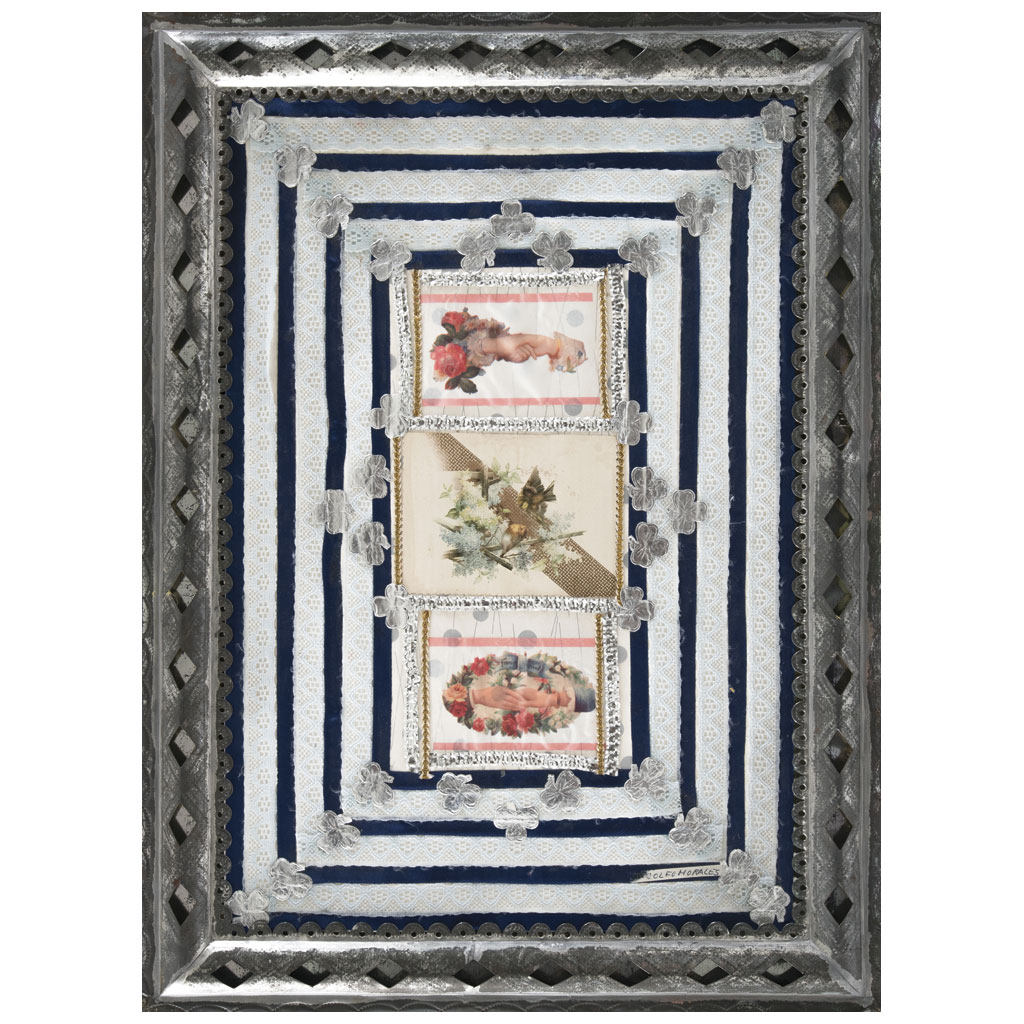 Subasta 857, Lote # 228 RODOLFO MORALES (Ocotlán de Morelos, Oaxaca, 1925 - Oaxaca, 2001) Sin título Firmado en una tira de papel Collage de textiles, papeles, imágenes y aplicaciones de hilo y listones sobre papel con marco de hojalata repujado El marco presenta ligeros detalles de conservación. En 1992 el pintor estableció la Fundación Cultural Rodolfo Morales A.C., institución al rescate del Patrimonio Arquitectónico y Cultural de los Valles Centrales de Oaxaca, además de organizar, con el apoyo del CONACULTA, el Festival Rodolfo Morales, el cual reúne a galerías de Oaxaca para compartir expresiones artísticas y culturales. Fuente consultada: "Rodolfo Morales, el Señor de los Sueños". México. Secretaría de Cultura, 17 de junio del 2004, www.gob.mx/cultura 59 x 44 cm Estimado $ 65,000-80,000