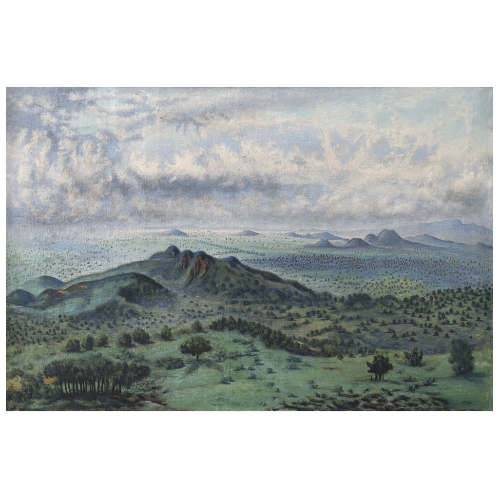 AMADOR LUGO (Santa Rosa, Guerrero, 1921 - Ciudad de México, 2002) Valle de México Firmado Óleo sobre tela sobre tabla Con recibo de compra de Galería Coyoacán, enero de 1972. Presenta detalles de conservación. 61 x 91 cm Estimado $ 30,000-40,000