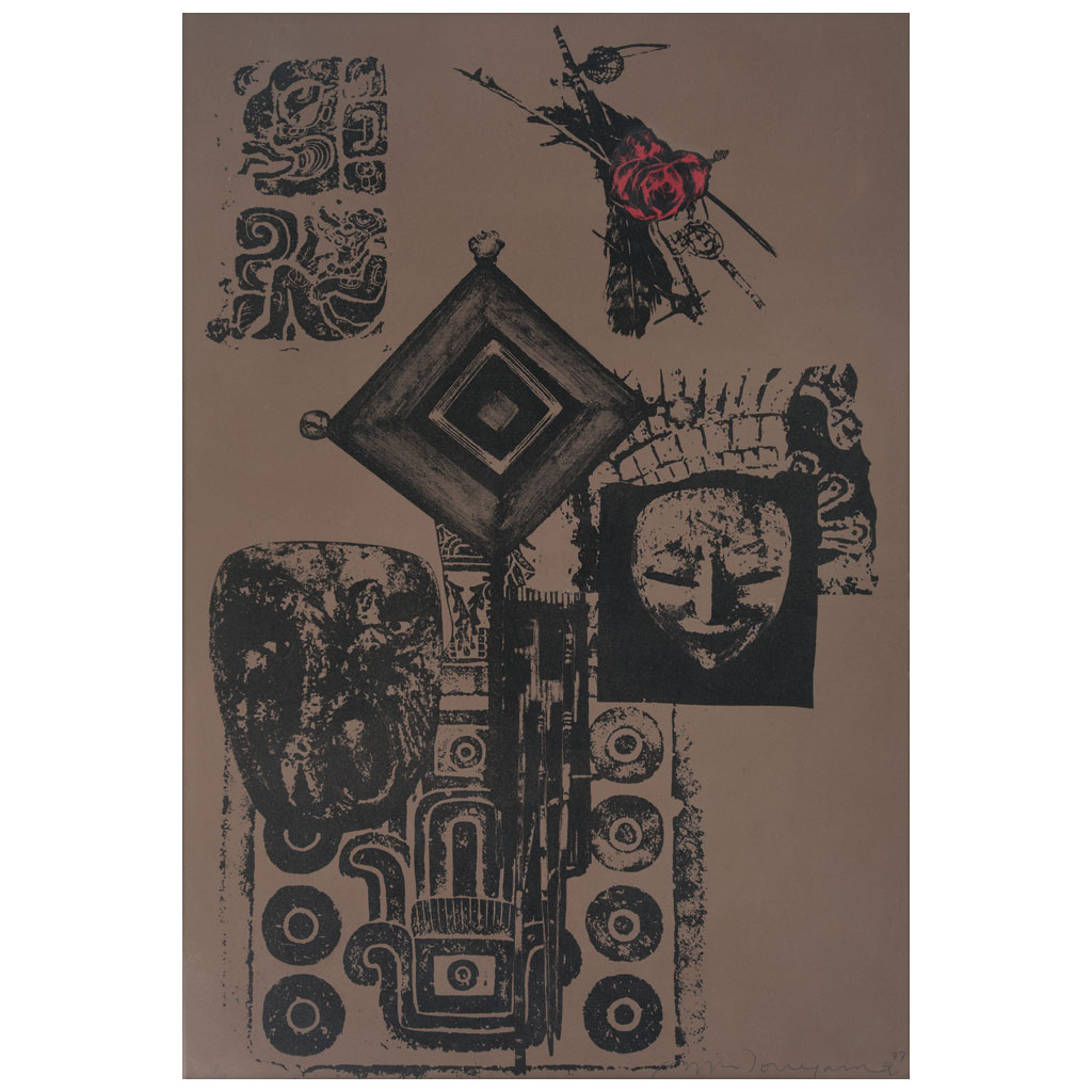 KOJIN TONEYAMA (Prefectura de Ibaraki, Japón, 1921 - 1994) Ojo de Dios Firmada y fechada 77 al frente. Firmada y fechada 1977 al reverso Litografía 3 / 15 Con etiqueta del Museo Taller Nishizawa. Presentó su obra en galerías y museos como The National Museum of Modern Art en Kioto, su trabajo ha sido subastado en Sotheby's. Toneyama fue un artista multidisciplinario, realizó acuarela, litografía y collage. Dedicó parte de su producción a representar las danzas ancestrales de Shishi Odori y Onikenbai, son coloridas y geométricas litografías donde figuran los demonios, danzantes con máscaras en actitud festiva o ceremonial. Estas se exhibieron en su atelier ubicado en Kitakami, lugar que se convirtió en memorial y museo después de su muerte y donde actualmente se presentan performances y exhibiciones. Fuente consultada: sitio de Ro Gallery www.rogallery.com/Toneyama_Kojin 88 x 60 cm Estimado $ 20,000-30,000