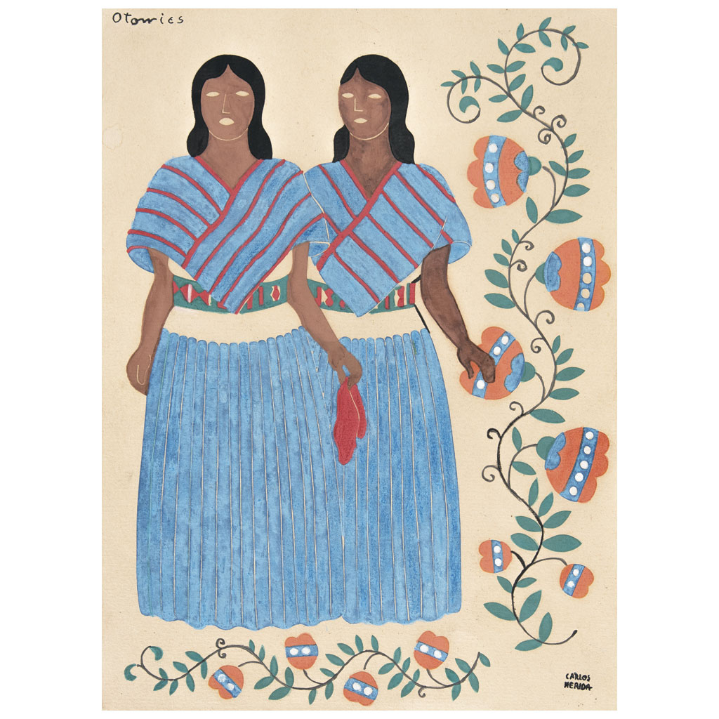 Subasta 857, Lote # 239 CARLOS MÉRIDA (Guatemala, 1891 - Ciudad de México, 1984) Otomies - Estado de México, 1941 Firmada Acuarela y gouache sobre cartón Con copia del certificado de autenticidad de Galería D'Arte, julio de 1995. La versión serigráfica de esta obra esta publicada en: DE LA TORRE, Mario. Carlos Mérida en sus 90 años. México. Cartón y Papel de México S.A de C.V, colección CPM, 1981. Esta pieza es la original a partir de la cual Carlos Mérida realizó la serigrafía para la carpeta "Trajes regionales mexicanos". Existen dos ediciones de la carpeta, la primera fue editada en 1941 con 25 piezas y la segunda fue editada en 1945 con 12 piezas, carpeta en la cual "Otomies" es la portada. 30.3 x 22.5 cm Estimado $ 90,000-120,000