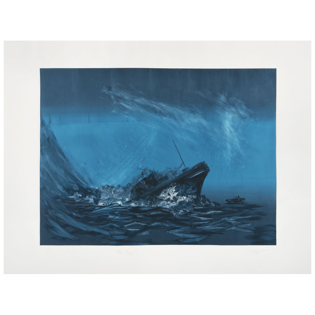 KRYSIA GONZÁLEZ (Ciudad de México, 1992 - ) Mal tiempo Firmado y fechado 2017 Monotipo 1 / 1 Con sello de agua del Taller Ramón Durán. "Su pintura se centra en sus propias impresiones del entorno haciendo así, de sus paisajes un ejercicio poético, a medio camino entre lo real y lo ideal. Esta joven artista representa en su obra la periferia de los puertos de carga, de donde se contemplan los fenómenos del cielo y de la naturaleza, las condiciones atmosféricas que envuelven a la percepción de la realidad, con un sentimiento lírico alejado de todo academicismo y clasicismo.". Rafael Alfonso Pérez y Pérez. 44 x 59 cm Estimado $ 8,000-12,000