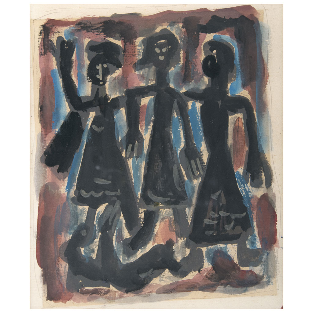 Subasta 857, Lote # 242 CARLOS MÉRIDA (Guatemala, 1891 - Ciudad de México, 1984) Trío Sin firma Lápiz de grafito y gouache sobre papel Con constancia de opinión de la Galería de Arte Mexicano, octubre del 2016. "Hay en su pintura, a medida que se observa más detenidamente, una íntima calidad emocional que resulta de la sutil combinación de una supersimplicidad de materia unida a una deslumbradora y decorativa belleza. Generalmente, en la composición de sus pinturas. Mérida desecha lo innecesario no esencial; cada cosa está simplificada a lo mínimo y entonces, en violentos contrastes, equilibra las masas de su composición, de acuerdo con un ordenamiento ya previsto. La composición generalmente está basada en la pirámide. Esto es histórico, sin embargo, original: recuerda las más fluidas composiciones de los modernos: Picasso, con sus péndulos, por ejemplo". Luis Cardoza y Aragón, 1992. Fuente consultada: CARDOZA Y ARAGÓN, Luis. Carlos Mérida. México. CONACULTA, Ediciones Era, 1992, Pág. 20. 18.5 x 15 cm Estimado $ 80,000-120,000