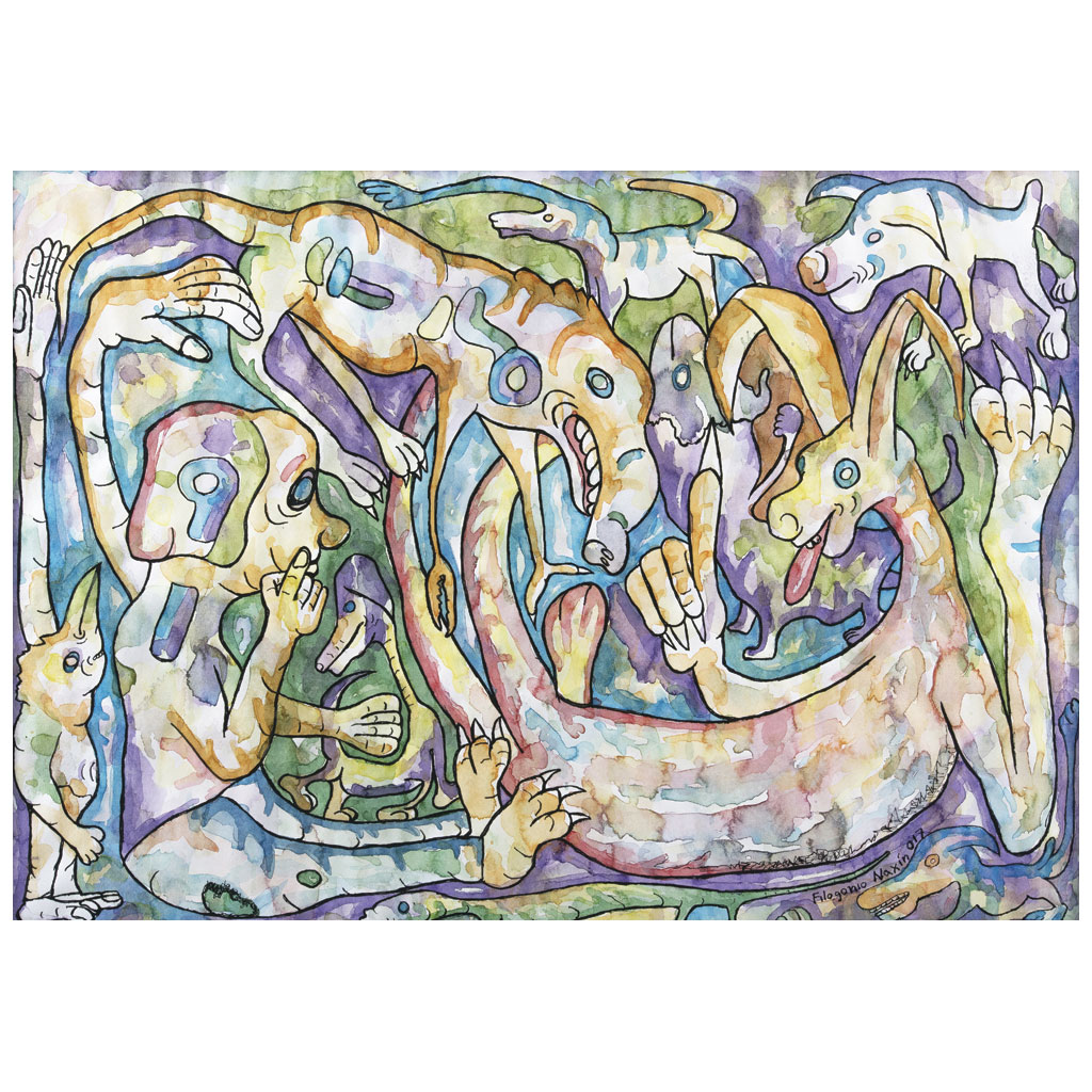 FILOGONIO VELASCO NAXÍN (Mazatlán Villa de Flores, Oaxaca, 1986 - ) Lagartija / Lamixkiee Firmada y fechada 017 Acuarela y tinta sobre papel Con certificado de autenticidad del artista. Es egresado de la Licenciatura de Artes Plásticas y Visuales de la Facultad de Bellas Artes de la Universidad Autónoma Benito Juárez de Oaxaca. Ha expuesto de manera individual en los espacios culturales más reconocidos del estado de Oaxaca, entre los que destacan la Casa de la Cultura de Juchitán, el Taller Rufino Tamayo y el Instituto de las Artes Gráficas de Oaxaca IAGO. Es autor de la publicación bilingüe en mazateco y español "Minu xi kuatsura chichjána, Kui anima xi bantiy ayajura. Qué cosa dice mi tata, seres que se transforman", editada por el Instituto Nacional de Lenguas Indígenas; su obra también fue publicada en el libro "Arte y memoria indígena de México" del Acervo de Arte Indígena de la Comisión Nacional para el Desarrollo de los Pueblos Indígenas. Su obra forma parte de diversas colecciones particulares y públicas. "Deseo que la gente conozca las leyendas de mi región, Mazatlán Villa de Flores. Nuestra cosmogonía abarca relatos de seres que se transforman, como el nahual y temas de la naturaleza. Cada región de Oaxaca tiene su propia cosmovisión". Filogonio Velasco Naxín. 50 x 70 cm Estimado $ 18,000-26,000